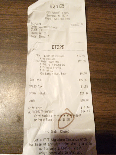 Read moreWell I headed to Arby's last night to give it another shot. 2/3/24. I've always had bad experiences and figured they've changed employees so it must be better at some point right? I recently was given a Arby's gift card for Christmas from one of my aunts.I had went through drive-thru and the order was $24 and change. I had told the employee working the window that I was going to use the gift card that had $20 on it and i would pay what the gift card did not cover with cash. He proceeds to use my cash first and then hands me the gift card back. I asked him if that's what he had done and he stated really rude and loud "YUP". Then proceeded to slam the window in my face. I waited for the manager to come to the window and told him what happened. He just asked for my receipt then circled the balance on my card on the receipt just to hand it back to me. I told him that was wrong of them to do that and no response. Not amused nor will I be back. Zero stars are needed...