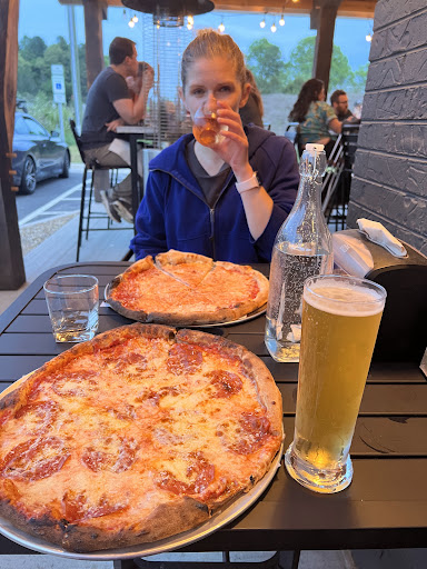 Ā Ā Ā Read moreWent for lunch today (a Thursday) around 130pm. Not too busy, but enough busy that you figure the food is good (also it smelled really good when we walked by in the morning!). Boyfriend and I split a sweet potato and kale pizza with balsamic drizzle, roasted walnuts, goat cheese and we added some local sausage to savory it up. The quality of the pizza dough/crust is so thin, so light, that you use your hand to support the pizza. It's delicious, and when I finished half of the pizza I didn't feel bloated or sinful at all. Fast forward to dinner time, around 6pm. Do we dare to have another pizza?? Heck yes we do!! This time we tried the hot honey pizza with added goat cheese. Worth it!! Recommend the drycider to drink with it's crisp apple coolness to go with the hot honey pizza. It's not too hot, and the lemon zest is surprisingly appropriate. Prices are not too high if you are splitting the pizza with someone else.... $20 for the hot honey pizza, $18 for the sweet potato and kale (added meat and cheese cost around $3 to $4) compared to the prices at Papa John's, and the ingredients are all or at least mostly local (veggies, meat, cheese, honey, even the cider!). So two pizzas and an alcoholic cider later, and I am a fan! All the people that worked there were kind and knowledgeable. We sat outside on the covered patio on a cloudy, drizzly, late spring day in the mountains. Nice music playing in the evening. Little bit of road noise, but that just comes with sitting outside in town. Definitely want to come back when we are in the Pisgah...