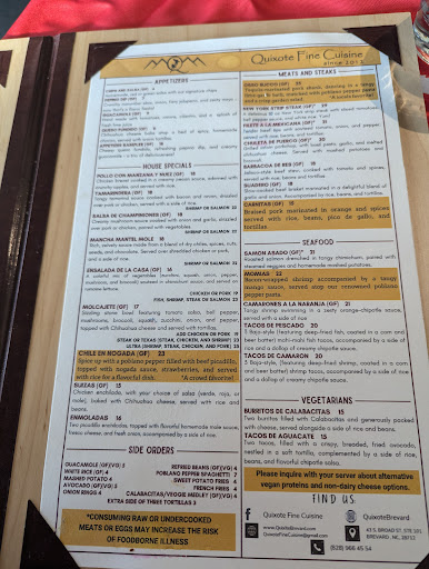 Read moreQuixote offers REAL Mexican Cuisine. You won't find food like this anywhere in the state or any state most likely. This restaurant sits on a corner in Brevard across from a malt shop and next door to a beer store. So you may not even notice it. However, please take note. As I said, this is a foodie haven serving cuisine that is worth every penny paid. I suggest the queso fundido (thick white cheese melted over chorizo and served with corn tortillas) to begin. The menu is unique and varied. The grilled shrimp marinated in orange juice (served with rice) is light but full of flavor. The osso buco was a pleasant surprise to find on the every day menu. It was cooked perfectly in a delicate tomato broth and comes with spaghetti in a creamy poblano sauce that was flavorful and acted as the perfect side. A small side salad was also part of the entree. The restaurant is very clean and we'll decorated to give you a feel of Mexico City and the hometown white squirrels here and there. Our waiter and all of the staff were friendly, attentive and knowledgeable. We will certainly be back soon and often. Can hardly wait to share this dining super star with friends and family. If you crave amazing cuisine at a reasonable price, get yourself to...