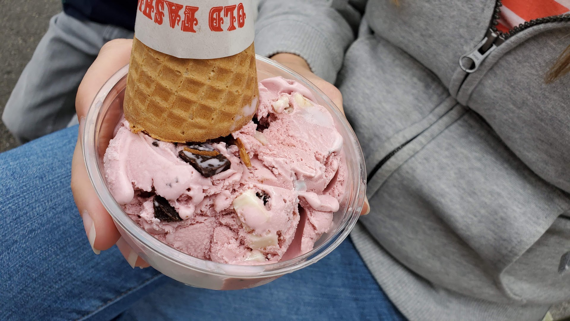 With social distancing we did not sit at the ice cream shop but right next door we sat on the benches at the marketplace.