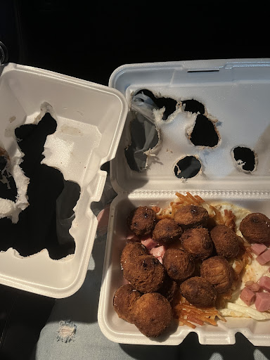 Read moreAs someone who’s out late a lot, there’s not a lot of food options for us on the night schedule. Usually love this huddle house- during the day. But whoever was working the early morning of March 31 really just ruined my day lol like who even does this? What you’re looking at is burnt melted styrofoam in my food. I ordered a ham and egg dish and an order of muffin bites. They decided to not make my order that I placed until I got all the way to the restaurant (20 minute drive) for some reason, I guess laziness, so I had to wait 15 extra minutes once there and just wanted to go home. Mind you, there are only two other diners. Then they had the bright idea of putting 15 burnt and extremely hot muffin bites (that’s supposed to only be an 8-count and also have powdered sugar and whipped topping but at this point who even cares, they’re unedible anyway.) straight into a styrofoam tray, no paper or anything to separate it. They completely melted through the styrofoam and into the top of the next tray in the bag, my dinner. Yum! Thanks so much...