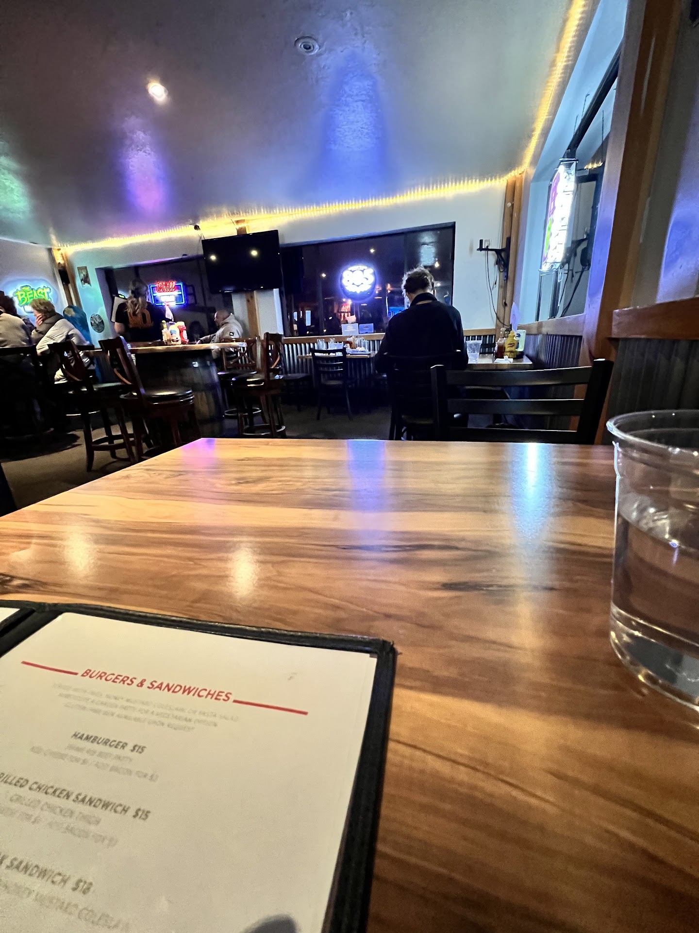 Good food and 1 great server. The other servers and manager have truly the worst customer service we have ever experienced. Their sign says 1.5 hours max at tables, my husband and family was at a table and our friends were at another. My husband and family left after they paid to go snowboard some more and I ordered my lunch as my friends indeedat the other table. Their table was full or I would have moved with them.. One of the guys servers came by twice to try and take my food away/clear the table in the middle of me eating and then the manager came and said, "OKAY, we need you to move to that table over there! We have people waiting for tables". I explained to her that she could have my food and we were leaving because they already tried to take my food twice . I was only sitting there about a half hour (maybe less!). We tipped the waitress well because she was a sweetheart but the manager and other servers are just rude. We were paying customers too and they were trying to push us out. We had 2 tables and spent quite a bit of money and did not even succeed past an hour at the tables. Just plain rude. Eat at the pizza shop instead. They have great food and beer with excellent service. You would think with one main restaurant and bar in this town they would have better...