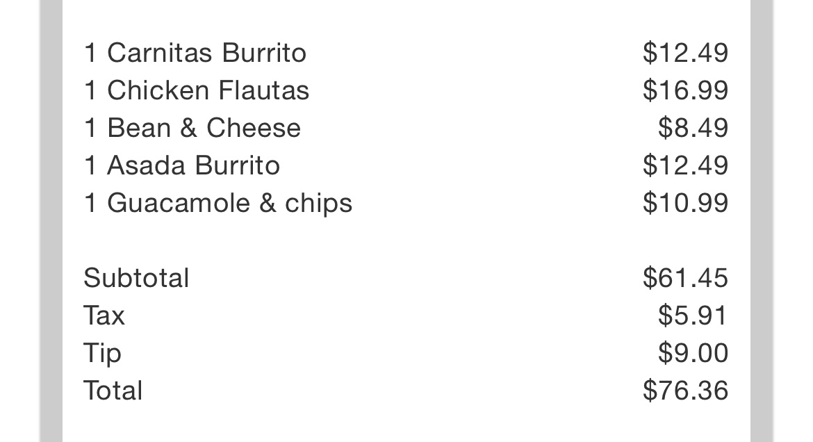 Read moreReally recommend this place! Their food gave us reason to return for a second night of take-out. Even in San Diego (I’m from) this would be a regular place I’d return to. All the burritos were Chipotle size (generous). The Bean & Cheese burrito was tasty and generous (made w/ lard so Vegetarians, enjoy something great for once but you are forewarned). The meat in the Carnitas Burrito tasted great, and was very generous (really good tortillas btw). The same goes for the Asada Burrito - generous meat (tasted great, only 2 joint pcs). My kid loved and ordered the Chicken Flautas Plate two nights in a row (generous serving). And finally the Chips and Guacamole on their own merit both tasted great and each generous in size, and $10.99 combined. I read some people complain about prices being $1-$2 more than city. Be realistic, the food across the board was great and a business in such a seasonal resort destination that doesn’t attract all that many skiers/tourists, has to find a way to survive. I can’t...