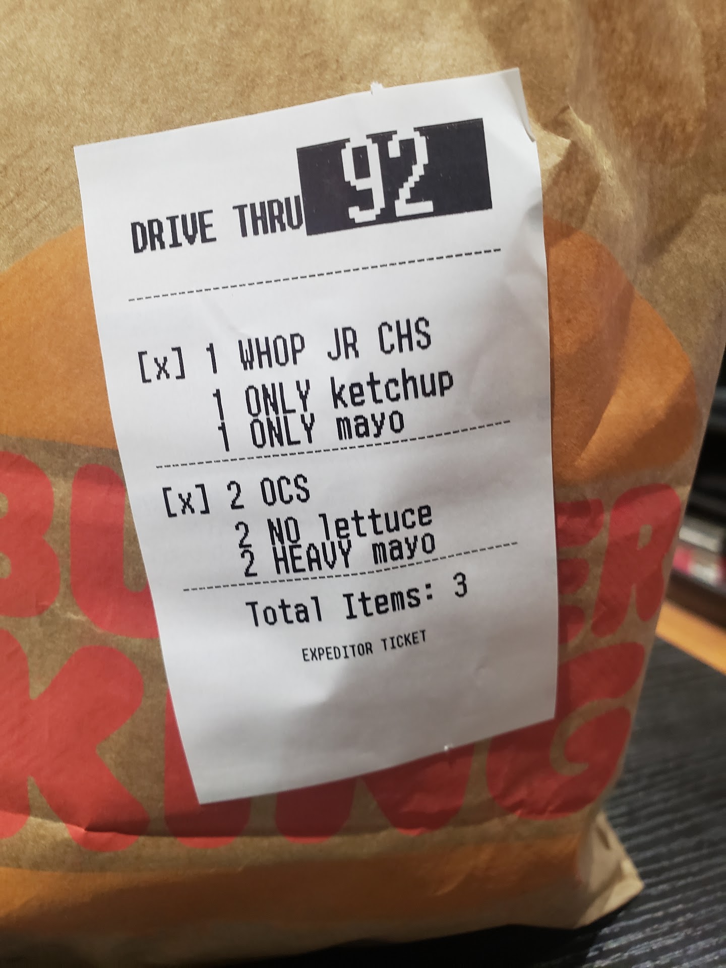 Lettuce, mayo, pickle, ketchup, It's OK if I don't want that, Impossible or bacon Whopper, Any Whopper my way.