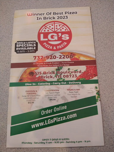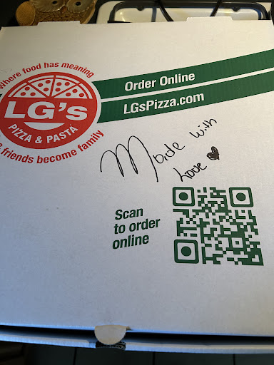 Read moreMy son Joey and I tried LG’s for the first time yesterday. Even with the outside dining, while ordering-I still looked around inside and the place was very clean, we were greeted immediately, everyone had masks on and it felt very comfortable. Good vibes, very personable and professional staff! BIG SELECTION of food, from pasta dishes, pizza, apps, salads, wraps, burgers, kids menu, desserts and more! HUGE SELECTION of DRINKS!! Nothing is sitting out, everything is fresh. Being Italian and coming from a big Italian family, my family can cook and so can I (all from scratch) With that being said, we’re picky with sauce and food from Italian restaurants. We’re originally from north Jersey, so finding a good spot down here is hard. My son compares everyone’s sauce to mine and my entire family’s lol but he ordered the pasta and meatballs (his fave) and he ate the entire bowl! He’s 11 and can eat, but if he didn’t like it, he wouldn’t have ate the entire dish! That says a lot, my son is picky! We also took three different pieces of cheesecake to to go. AMAZING! We’ll definitely be returning customers and ordering delivery as well. Joey and I give this place 5 stars based on cleanliness, freshness and quality of food and how we are treated from the minute we walked in the door. First impression is everything right? Even the delivery guys that were waiting on their to-go orders, were very nice and personable. I’m a personable person myself, so I like that. LG’s is definitely our new spot! Thanks again guys and I told you Joey was going to eat that whole dish! 😊 🍝🍕🍰