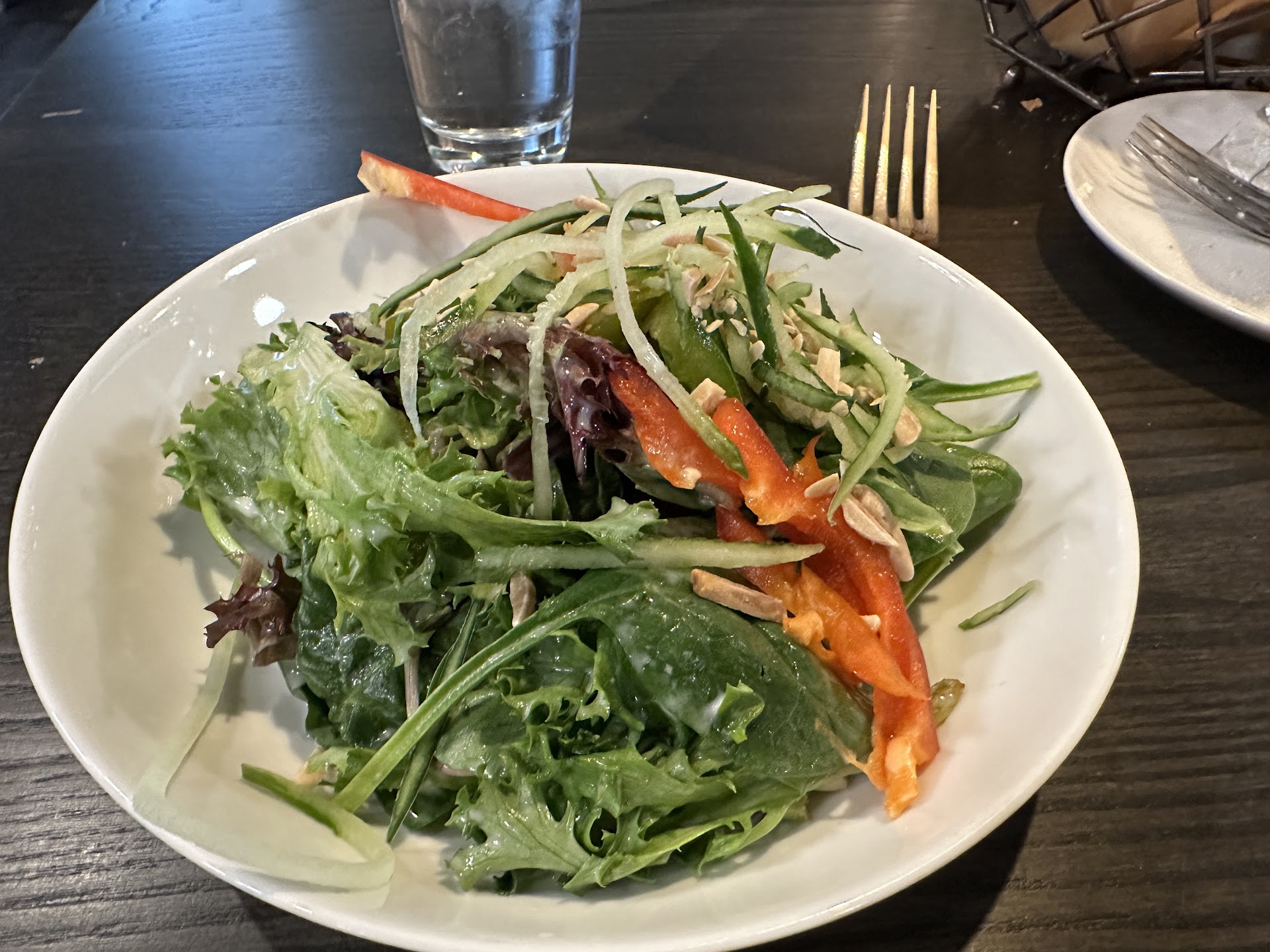 Two at my table ordered the lemon chicken dish and a third ordered a seafood pasta, everything was outstanding. The complimentary bread they bring to the table was soft and warm with a crisp skin. The house salad is a unique blend of spring mix with some kind of nuts (Brazil?) and a light oil dressing.