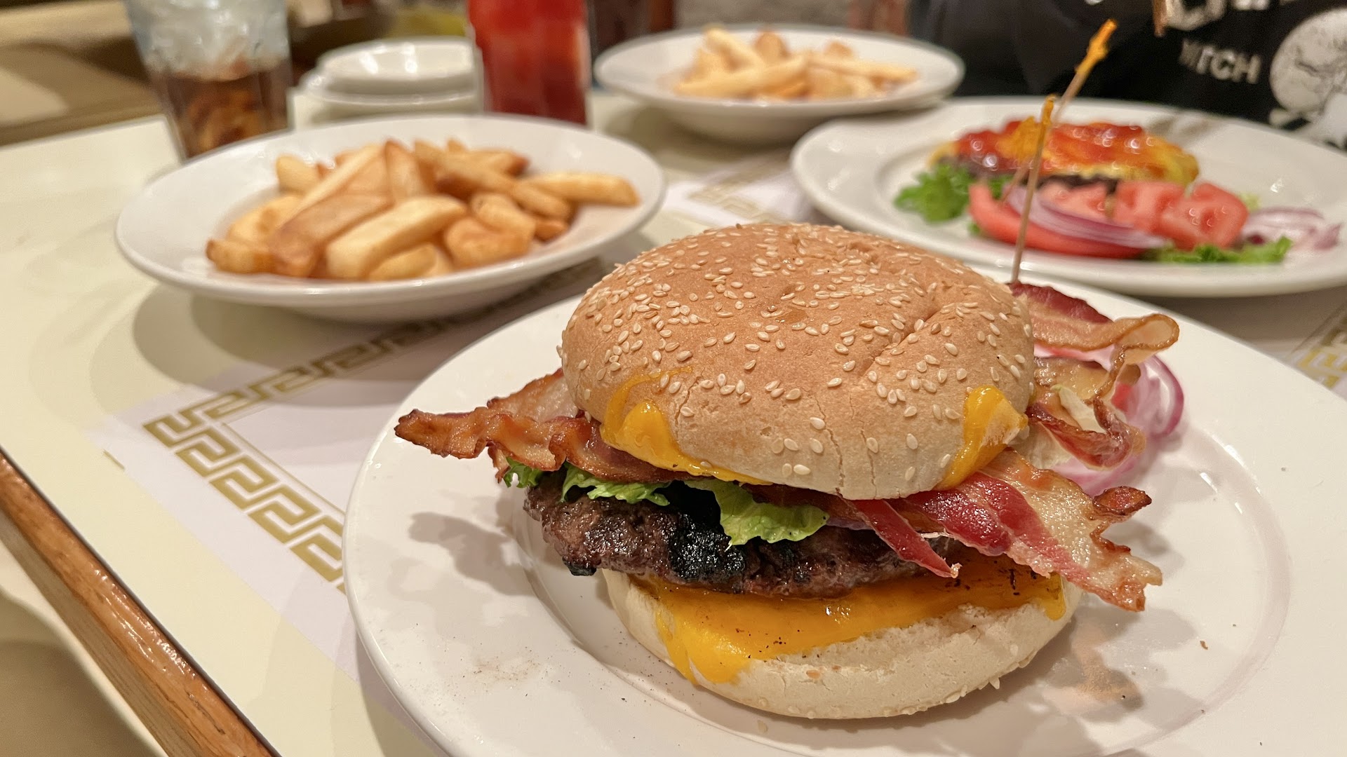 I got baked stuffed clams and a regular burger for my meal. The clams were okay, but they put a huge blanched tomato with feta cheese burnt to a crisp on top. Very weird, but it didn't get in the way of the clams so whatever.