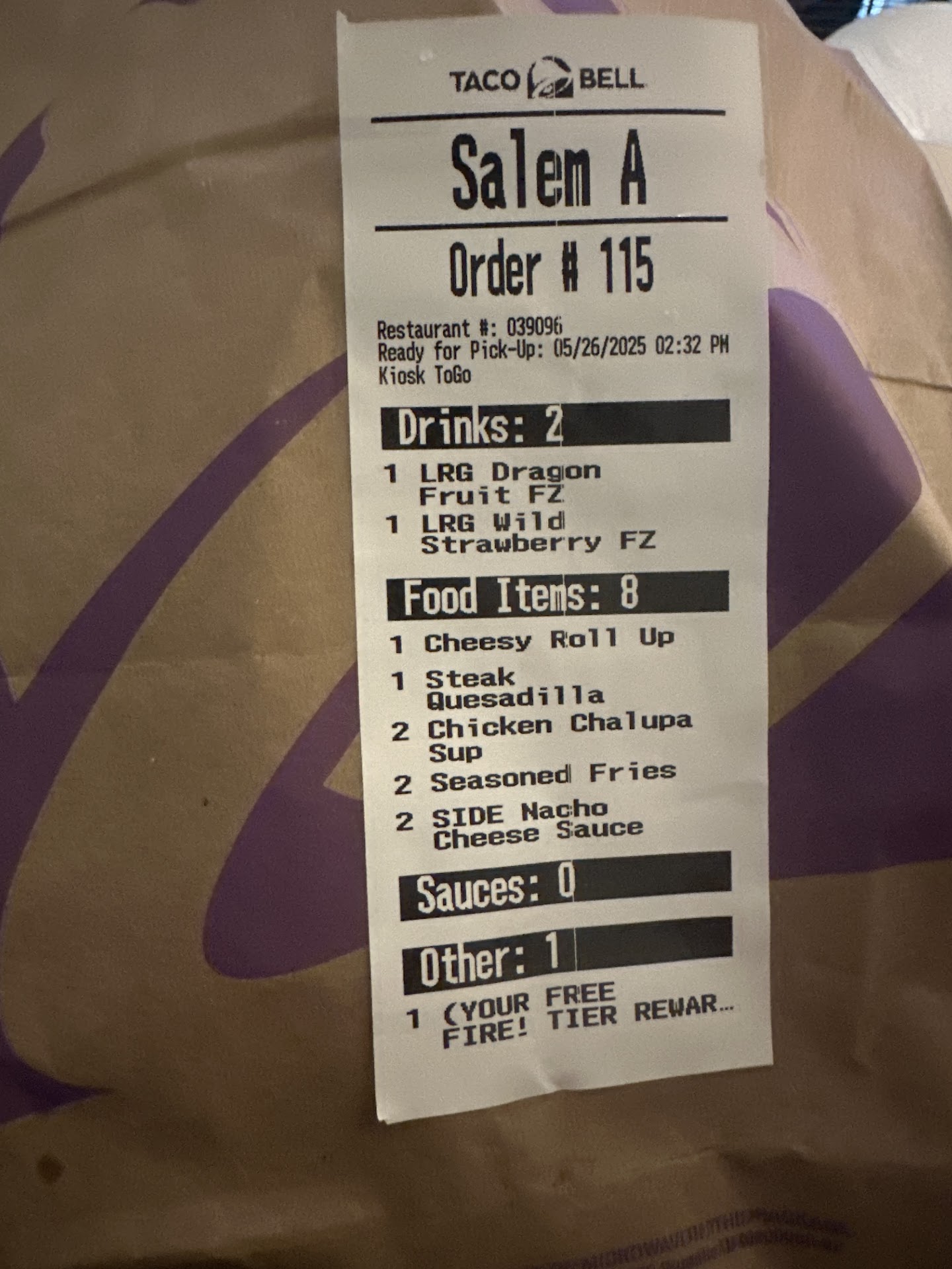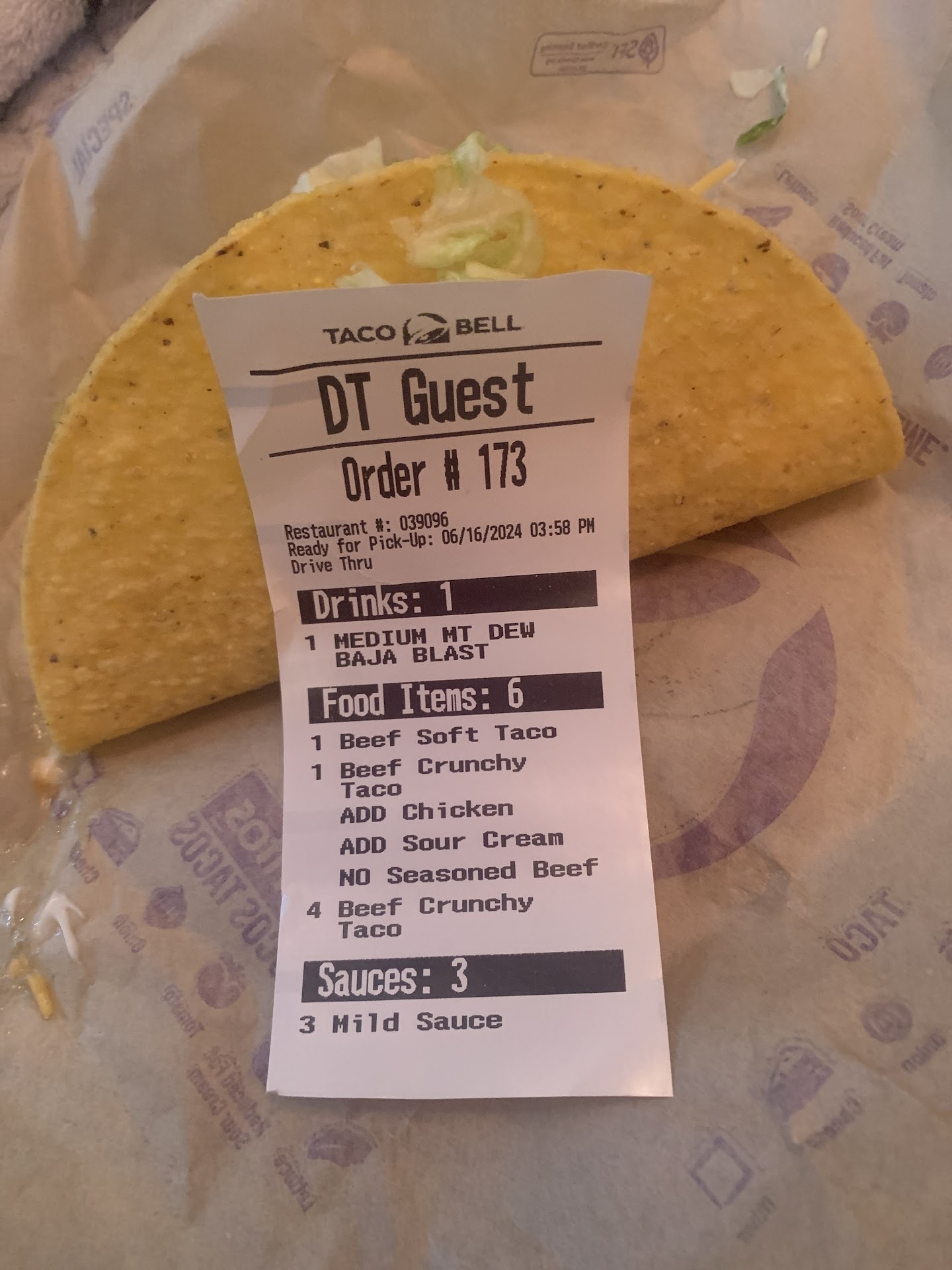 Taco Bell is usually one of my "Go To's" , when I don't feel like cooking, want something quick, but want something more than the same old burger and fries at every other fast food place. But being honest, recently every time I go there, everything I get, is a sloppy mess, the meat is falling out and the sauce is all over the place. I'm always missing something I ordered. It seems like they don't take the time to prepare the food correctly. But big bonus stars on the nacho fries!!! They are awesome they taste so so good. I mean I had to go back inside and buy another order of them cus they were so good, they were so good that I sent to taco Bell specifically to order just the nacho fries BUT WHEN I GOT THERE THEY TOLD ME THAT THEY AREN'T SELLING THEM ANYMORE, THAT IT WAS JUST A PROMOTIONAL THING!! ARE YOU KIDDING ME, THAT WAS THE ONLY REASON WHY I DROVE THERE, SO I JUST LEFT. Like really why would you add a new food item just to take it off. Bad idea...