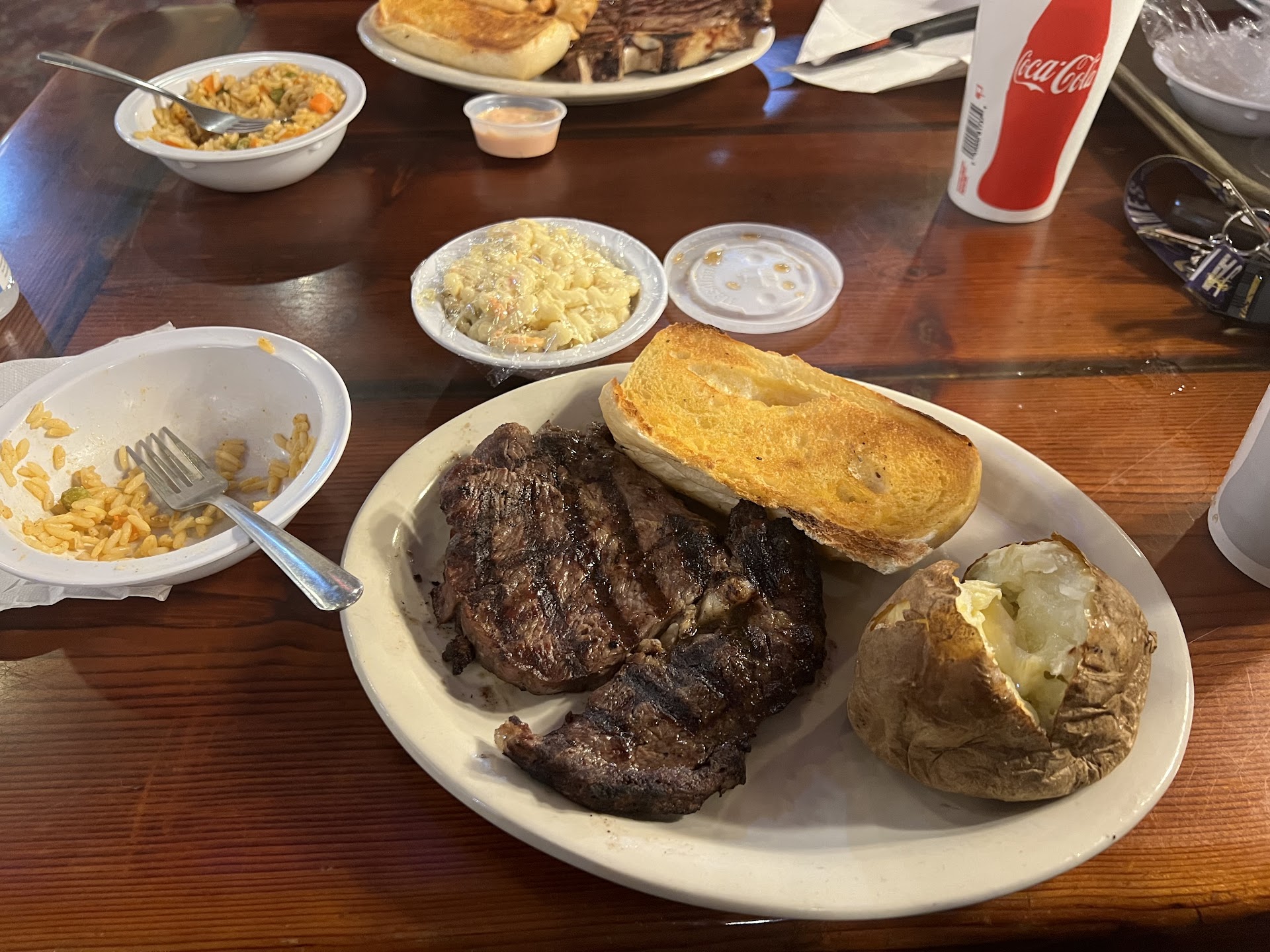This place has been around since the 70's, and yhe decor reflects it. The steaks are, in a word, horrible. Dont come for that. Come for the salad bar, which is one of the best ive seen and it includes dessert and soup and pasta. The entree prices are fair, but where they kill you is the ancillaries. $2.69 for fried onions? Or mushrooms? Or corn on the cob? $3.59 for a piece of cake? And get this; in the world of bottomless sodas from chilis, outback, etc these guys have NO FREE REFILLS! Ridiculous! Heres how you eat here inexpensively: order the number four beef patty as all the numbers items come with the salad bar included. Did not get any other ancillary do not even get soda get water. Your bill with tax will be approximately 10 bucks per person and you'll be able to stuff yourself at the salad bar and the other pasta and soup bars as well as the dessert bar otherwise with the ancillary you're easily doubling the bill for soda dessert corn on the cob etcetera. If you do as I say this place is a tremendous value, you can give the beef patty to the dog if you'd like but you can have the baked potato and garlic bread that comes with it. If you don't do as I say you might as well go eat somewhere else for better...
