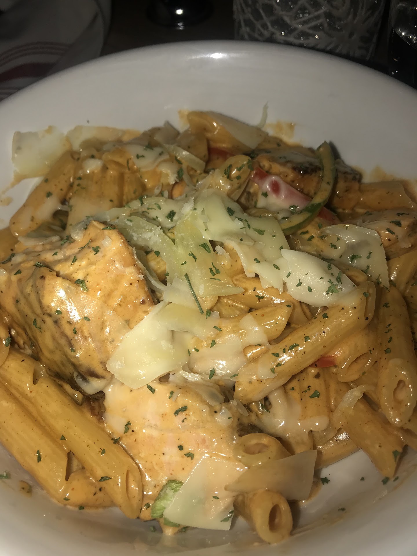 Although the food was delicious, it was hard to thoroughly enjoy the salad. I don’t remember the name of it but it was way too overdressed with their vinaigrette. The pasta was great, but would have been phenomenal with much less oil (I could taste it and see it pooling at the bottom of the bowl). I also felt like it was missing something as far as seasoning goes, but it could just be that the oil was too overpowering. The pasta reheated well, the salmon was still tender, but, of course, the dish released even more oil which made it look very unappealing.