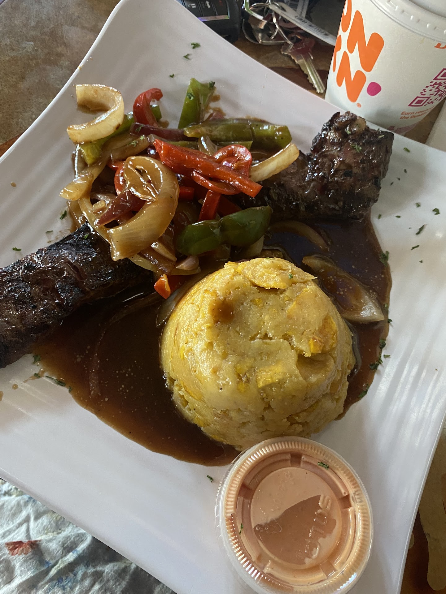 The wings come out and hour from ordering. They were very good. 20-25 minutes later the food came out. Two orders of Carne Frita with tostones ( I wanted maduros instead of tostones but the girl said I would have to buy them separately as the side choices were tostones, mofongo, or fries no wiggle room to swap out plantain choice). My brother wanted chuleta can can but she said they were all out. My hubby and sis in-law ordered two churrascos ( my husband ordered it medium came out well done) it was soft so he didn't complain. He got tostones, my SIL got Mofongo. Lastly one order of maduros. The food was well presented and a good portion. They do only give about 6 big tostones. Mofongo is a nice side served in a pilon. SIL ordered another pina colada and hubby too. These didn't come out until everyone was almost done with their food. Another party had come in and didn't stay and then another party arrived, and the girls back up as well.