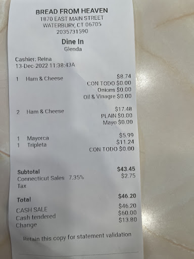 Ā Ā Ā Read moreI went In the early afternoon and the quesitos were very dry and had almost nothing in them. I was extremely excited to get them here because I had went before and they were amazing. I have been craving them since the first time I went last year and it was pure disappointment today. They also charge .50 cents more then the one in New Haven. New Havenās location is sooo much better...