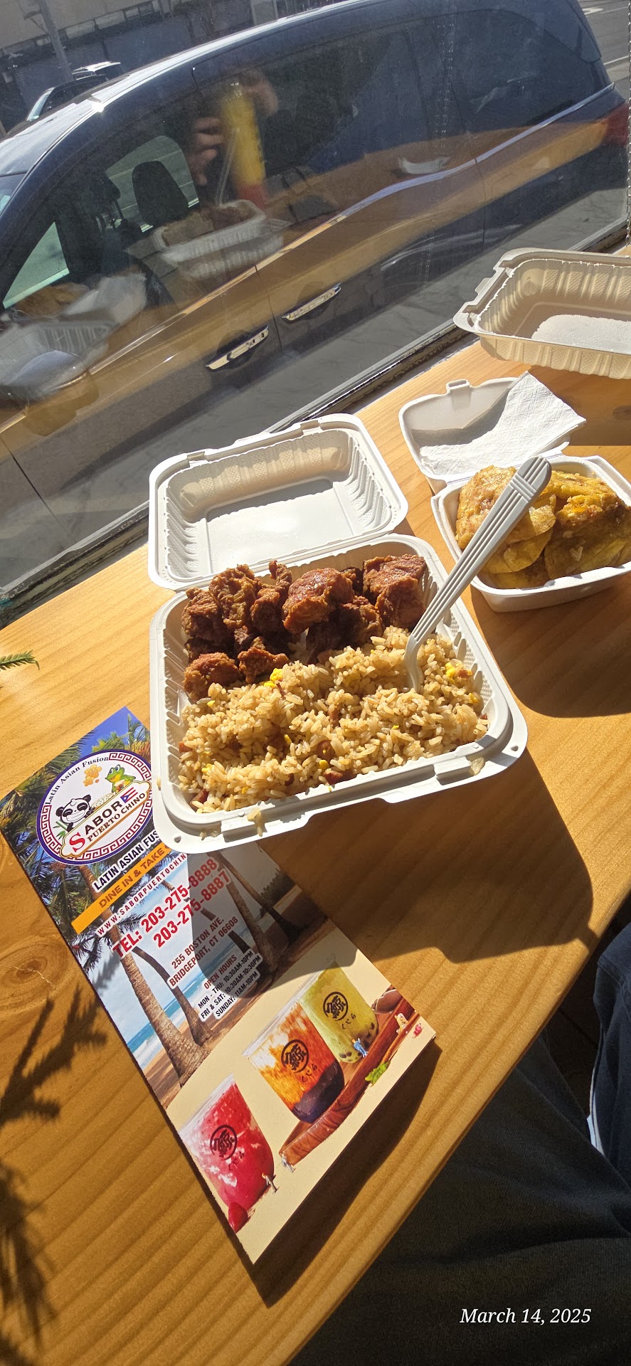 Decided to dine in because tostones get soggy quick and I was really excited about this addition to Bridgeport. Since you pay first at counter, I tipped on dine in. 25%. The woman told me to sit and that they would bring me my food. After a 20+ minute wait another woman called me to the counter to fetch my PACKED food. Packed in plastic container and fully soggy, that is the meal that I got for $17+ dollars plus the 25% tip. I spent around $22 I believe, for a dish that I could have gotten at any other Chinese restaurant for $10 with an egg roll. I am so disappointed at the waste of money to not even...