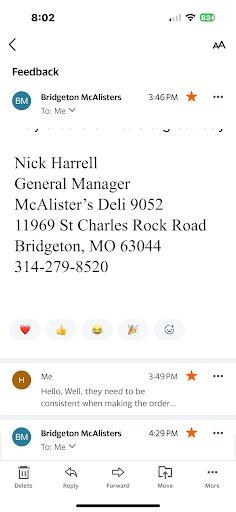 Read moreThe 3 workers were really nice. The chicken Cesar wrap was NOT good at all. I ordered 2 and they were falling apart bc there wasn’t enough stuff inside to roll a wrap so it is just limpy and everything falls out. The ceaser wrap was cut with a dirty knife because there’s mustard swiped right down the cut. The dressing on the ceaser was not tossed well and the chicken was shredded and not as described in the menu. Spent 26.00 on this and no drinks. Added bacon to one wrap. Hardly had it inside and like I said it all just fell apart bc there’s nothing inside. Upside to a mac n cheese and I would have expected a Mac like St. Louis bread company for the price but this was like KFC mac or like a heat lamp buffet Mac n cheese. I mean my kid ate it but yeah. If I owned this franchise I’d be seriously taking a look at who I have behind that window making food for people bc they probably getting paid the most and doing the least thinking they know how to good. This was our first and last time at this McAllisters and you would have thought that even them all knowing we had never been before that the cook would have tried to toss a salad and make a dressing no so sour and every part of the quality portion and price was below and this is my first complaint ever in my life. I would have contacted this store directly but their website isn’t in operation and there was like 2 customers in this entire huge store and I can see absolutely why and what a waste of money bc the one in wentzville is really busy and tastes hella good. I wish I could get my money back forreal bc I spent 30 dollars on a meal for me and my son and it’s Friday and now we are making sandwiches at home later bc this was so disgusting. This store will absolutely go out of business this year if the owner doesn’t r see or care. What a waste...