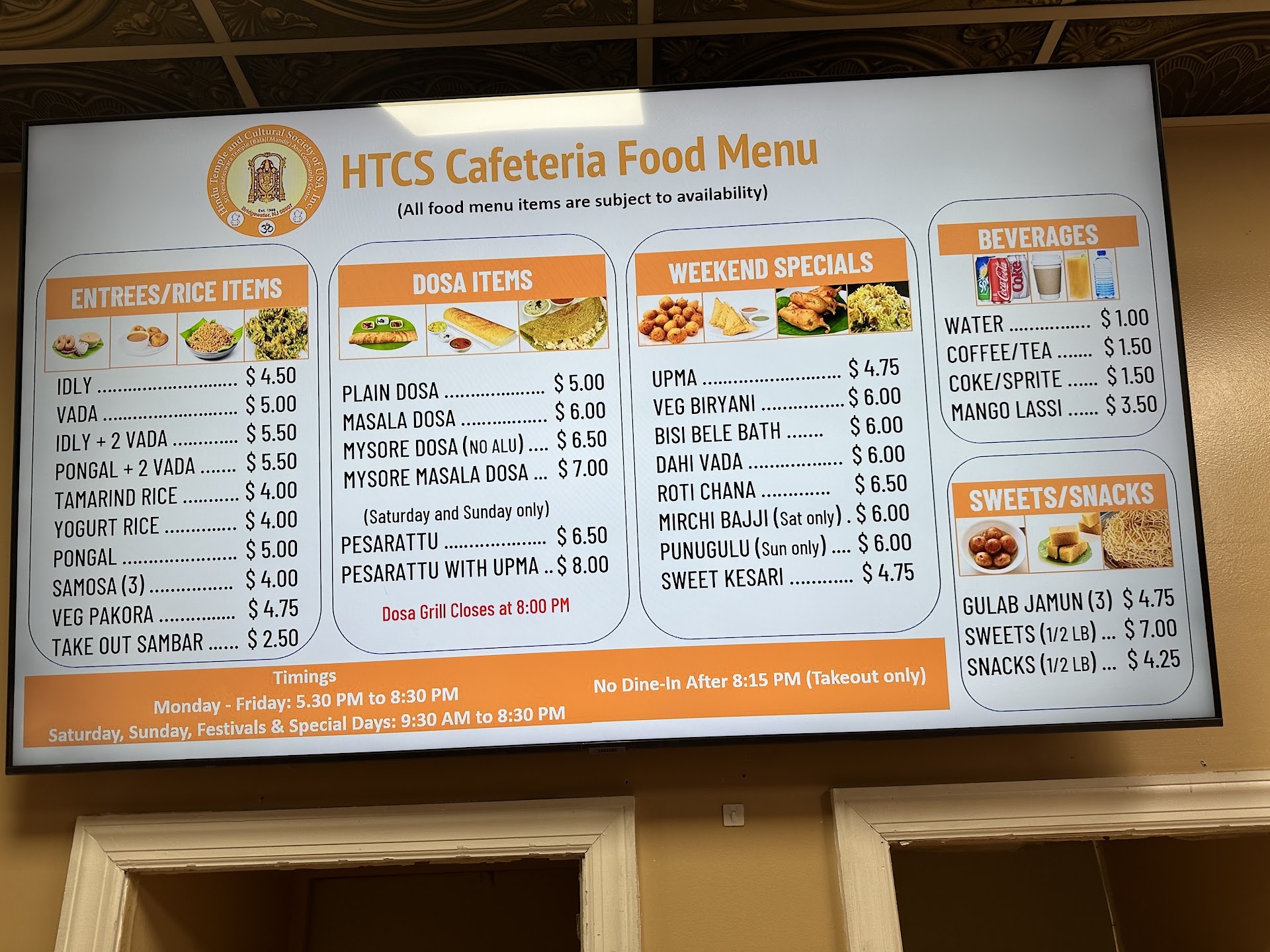 after Darshan, I guess one must visit the cafeteria, I loved their tamarind rice & Pongal. you can find many options on the menu and I guess prices - that's shocking, none of the items are above $5 and I don't know how they are managing it ( I guess it's a non-profit cafe). in this inflation time, how one can sustain providing quality food under $5?