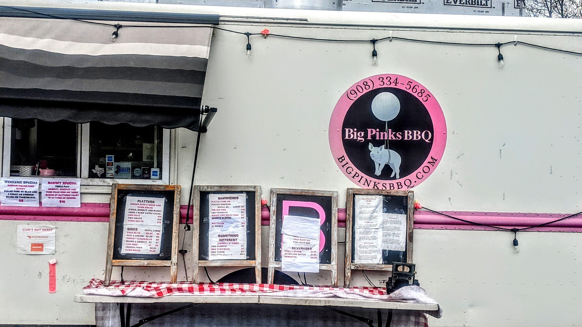 For the first time since moving north I can say this is really good BBQ without the qualifying 'for New Jersey.' We had the 1 meat special platter today - 1 with brisket and 1 with burnt ends. The platter came with 2 sides plus cornbread and (today anyway) a drink. Both the brisket and the burnt ends were smokey, moist and plentiful in the serving, with a good balance of lean-to-fat for flavor. There's a wide range of sauce choices from around the BBQ world, and you may add them freely to your meat. We liked the house Big Pink the best. Sides we tried were the coleslaw (both of us had this and both decided it was not to our taste - it's of the mustardy-vinegary type rather than the creamy sweet), the cheesy taters, and the baked beans. I had expected tater tots for the 'taters' but I was pleased to find it was roasted cubes of potatoes with melted cheese and spices - very tasty while it was hot. The beans were a real winner, mixed with that wonderful brisket and great sauce. As with the meat, the sides were large servings, and the cornbread (moist and not overly sweet) was also a generous chunk. Both meals came to $21, and we had leftovers when we finished. We're told that picnic tables will be arriving soon (hope they will also have umbrellas cause that parking lot is wide open to the sun!) In the meantime, plan on eating in the car or back of the pickup, bring your own chairs, or just...