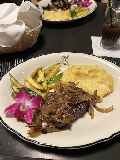 Read moreMoved to the area and wanted to try out this restaurant. The positives are the ambiance is nice in there. The staff are friendly and there was an older gentleman playing the piano all evening which was very nice. The restaurant is older, at times though it did feel a bit dated vs intentional/well kept. The booth seats are a bit too low to the ground compared to the chairs. The food took close to 30mins to come out (even just the salad). The restaurant wasnt that busy. The courses in general were slow, so wonder if they have limited amount of chefs. We got the scallops to start which were fine, nothing to write home about. For mains we got the filet mignon. Both meals came with a purple flower which I thought was a bit odd. The vegetables that accompanied the steak just didn’t seem appropriate or from the correct season. The mash tasted like smash (out of a packet). After tax etc the filet is over $60. Honestly for that price we were quite disappointed. We both order medium rare one came out that way the other was more medium/well done. When we both order the same thing its very easy to compare. The garlic bread was good and the salad was fine.