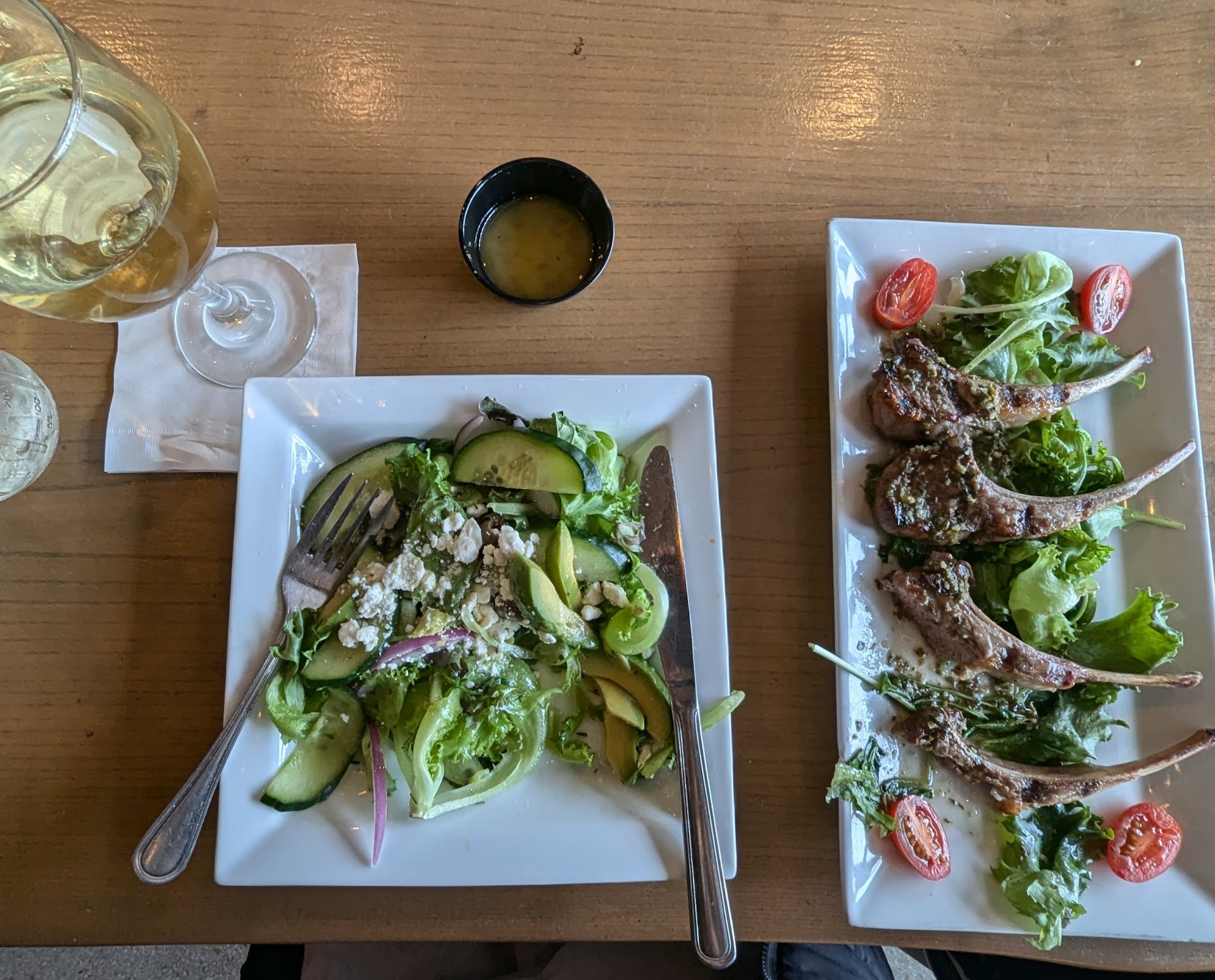 I didn't want anything super heavy so I ordered the avocado salad and the lamb lollipop appetizer. It was a great combination with a glass of wine. I was a little disappointed they didn't have a dessert menu (they said they could get me a slice of banana bread or something which was nice), but I wanted dessert dessert, so I ordered a hot chocolate. With Whipped cream it ended up being perfect.