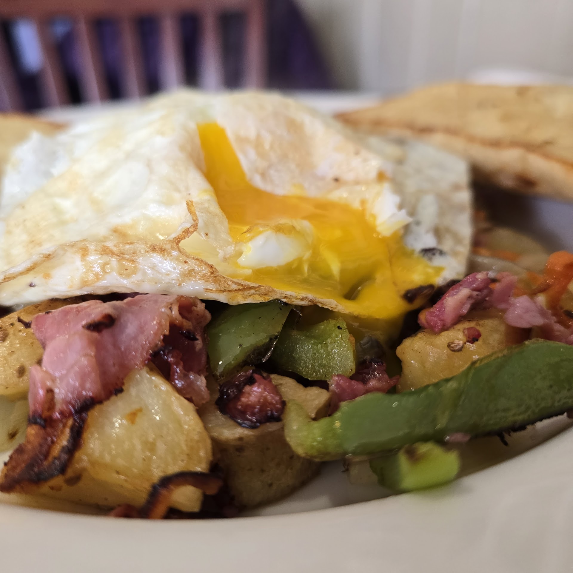 Had a late breakfast with my mother and daughter. Two large pancakes with butter, syrup and a side of bacon for the little one. My mother and I had the Hash, 2 eggs, choice of toast and corned beef hash. I also enjoyed a side of Duck Bacon. It was very good. The hash came out with a surprise. Had onion, green pepper and I think carrot slivers mixed with fresh potatoes and strips of corned beef. Most certainly home made. It was heavenly. I also enjoyed a well poured and we'll made single espresso.