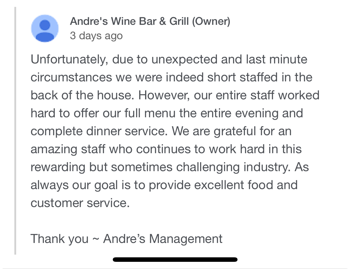 Just had dinner here with my husband for his Birthday. Alina our waitress was a total sweetheart. She was a little frazzled because they were short staffed (as many restaurants are). Tonight was a night where a lot of people felt the need to complain whether it was their table selection, they only wanted to sit in certain sections, etc. we had an absolute wonderful dinner, everything was perfect from beginning to end. Every staff member we encountered was nice, pleasant, respectful and had smiles on their faces. I felt so sorry for Alina she had this one couple that complained about everything. She bent over backwards for these people and nothing she did or said was good enough. The couple made sure to tell her several times it was the husband’s birthday. Alina explained that they are short staffed and doing their best and the woman actually had the nerve to say “Well it looks like you have enough people “. Seriously lady!! How about you throw an apron on and give it a try. This couple looks like the kind that makes a living out of complaining trying to get free stuff. Well this restaurant and their incredible staff do not need people like you. Next time stay home and make your husband a birthday dinner. To the owners and staff at Andre’s keep up the great job!! We will be back for sure and will be bringing family and...