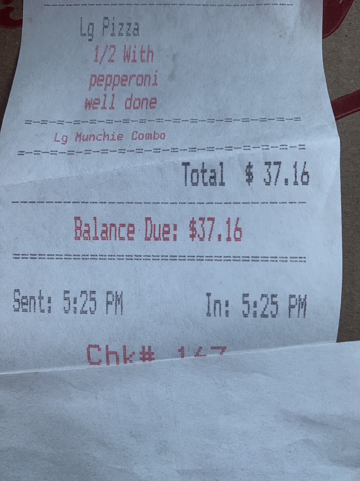 The food: We ordered (1) medium pizza with extra cheese, (1) small order of fries, (1) small order of mozzarella sticks, and (1) 2-liter of soda totaling $28.63 before tip for the delivery driver.