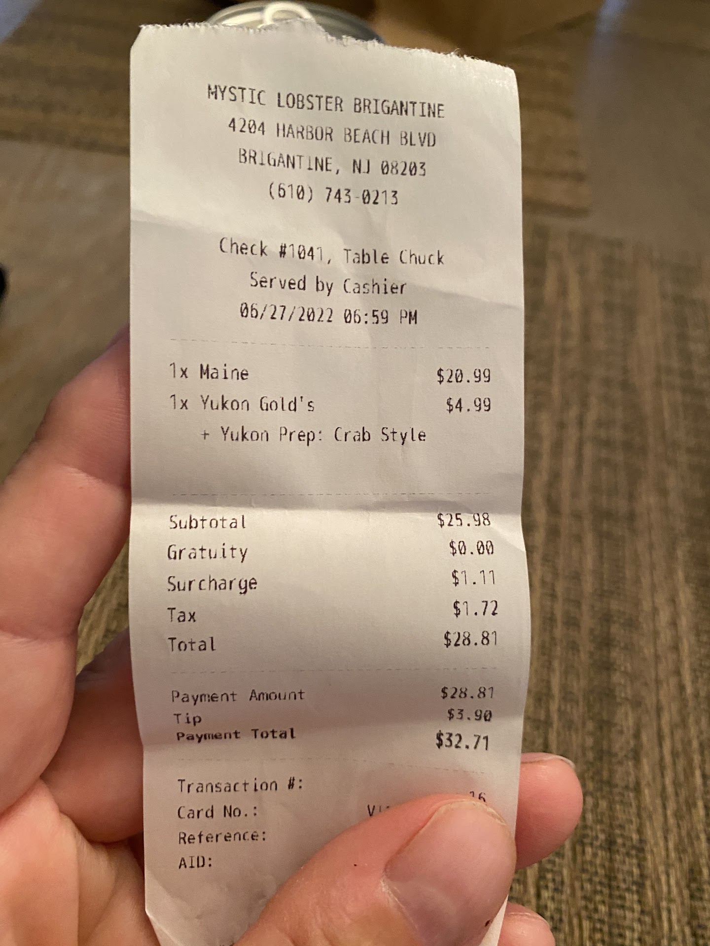 Ā Ā Ā Read moreFinally tried the Mystic Lobster Roll Co. I really wanted to like this place, but honestly, the food was just OK and the cost was outrageous! Paid $32.71 for ONE person, glad I did not bring the family, I would have had to mortgage the house. Had a Maine Lobster Roll and the Yukon Gold Potatoes side. They give you a super small (about 1-2 tablespoon) side of coleslaw and a single pickle slice. The portion size of the roll is ātinyā. See my finger in the photo for perspective. They claim 6ā but it looks smaller than a typical hot dog bun. Should have got out the tape measure. The Yukons were warmed up with melted butter and Old Bay seasoning on top. Not a fan of the 4% surcharge when I offered a debit card transaction, and of course, left a 15% tip for the young girl working the counter.