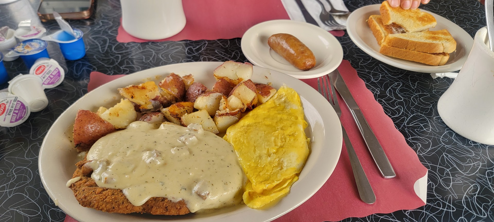 Read moreFound this little gem on a cold Sunday morning about a week ago (mid-April 2023) and my family and I are so happy we did! The atmosphere is very cozy and “homey”. We were greeted warmly as soon as we walked in (party of 3) and welcomed to sit wherever we liked. Upon sitting, our waitress came right over and took our drink order (all coffees) while handing out menus. Our coffees came out super fast and we had all the fixings needed (sugar, regular and diet) cream, milk, etc. Our waitress even offered French Vanilla creamer (my fav!) :) As for our meals, we had biscuits with sausage gravy, chipped beef on biscuits, eggs with bacon and home fries, and a side of toasted blueberry muffin. Everything came out so fast, hot and incredibly delicious. Their gravy for the sausage gravy and chipped beef is probably one of the best we’ve had in this area in the past 3 years of having moved to PA. It is so flavorful and the perfect consistency. Our waitress checked on us frequently and was very personable and pleasant, even joking with us about SOS (my husband didn’t know what it meant!) Aside from their great menu with its selections of breakfast items, there was also a specials board with other items not on the menu, which all sounded amazing and made it hard to choose on what to get! They also serve lunch as they stay open a bit past noon so we will definitely be back soon to try their lunch menu. Just a note, they’re cash only. We didn’t notice if there was an atm available as we checked online before hand if they accepted cards or not and came prepared but we found the prices to be reasonable and their portions generous. Thanks for a 1st...