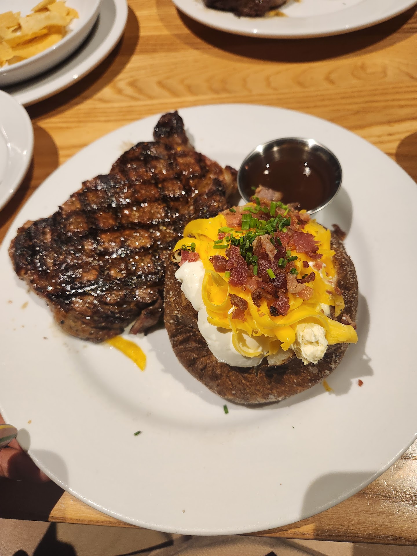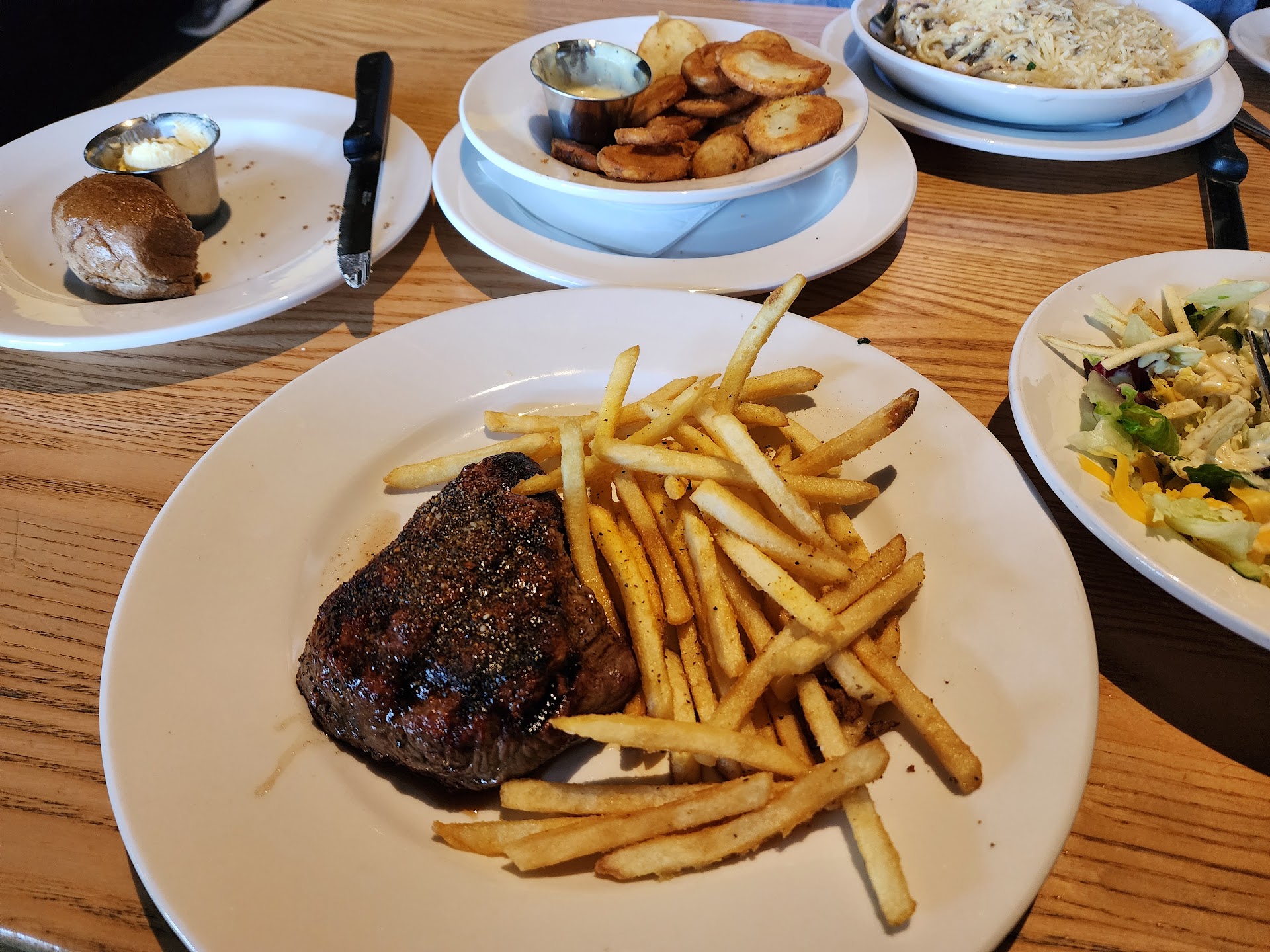 First, I would like to say Becky was a phenomenal waitress! I lived for her Christmas accessories she added to the uniform! Now on to the food...Their rolls are amazing! I'm a sucker for pumpernickel, so they had me at hello. The honey butter just takes it to another level (10/10)! We had the spinach dip to start (8/10). I think some artichokes would have taken it up a notch, but the flavor was good. I think their appetizer menu could use some better options. We went on a Saturday, so they had half priced bottles of wine. Becky gave me a sample to help me make my final decision. We indulged. We didn't finish the White Zinfandel, but she corked it for us to take home. I had the Ribeye (9/10) and Becky recommended the Hawaiian Ribeye so my bf had that. He gave it a 10/10 due to the flavor and perfect cook on it. He said it was better than Houston's which speaks volumes! I tried it and I'm inclined to agree. Now we both ordered our steaks medium. Mine was cooked a little under. However, I didn't finish it. I took it home so once reheated it was perfect. I got the loaded baked potato and he got the loaded mash. They salted the skin of the baked potato, so they won me over with that and the mash was easier to enjoy of course, either way both were a 10/10. We also got caesar salads which are classics and kinda hard to mess up. Overall, I thoroughly enjoyed this place and can't believe it's taken me so long to try it. They have a nice atmosphere and the lighting helps to create a nice romantic ambiance. The full body mirror in the ladies bathroom was a plus too! Becky was so sweet, polite, and attentive. Our cups were never empty and all finished plates were removed quickly! She also set me right with some bread and water to go, as well, which was greatly appreciated! We'll...
