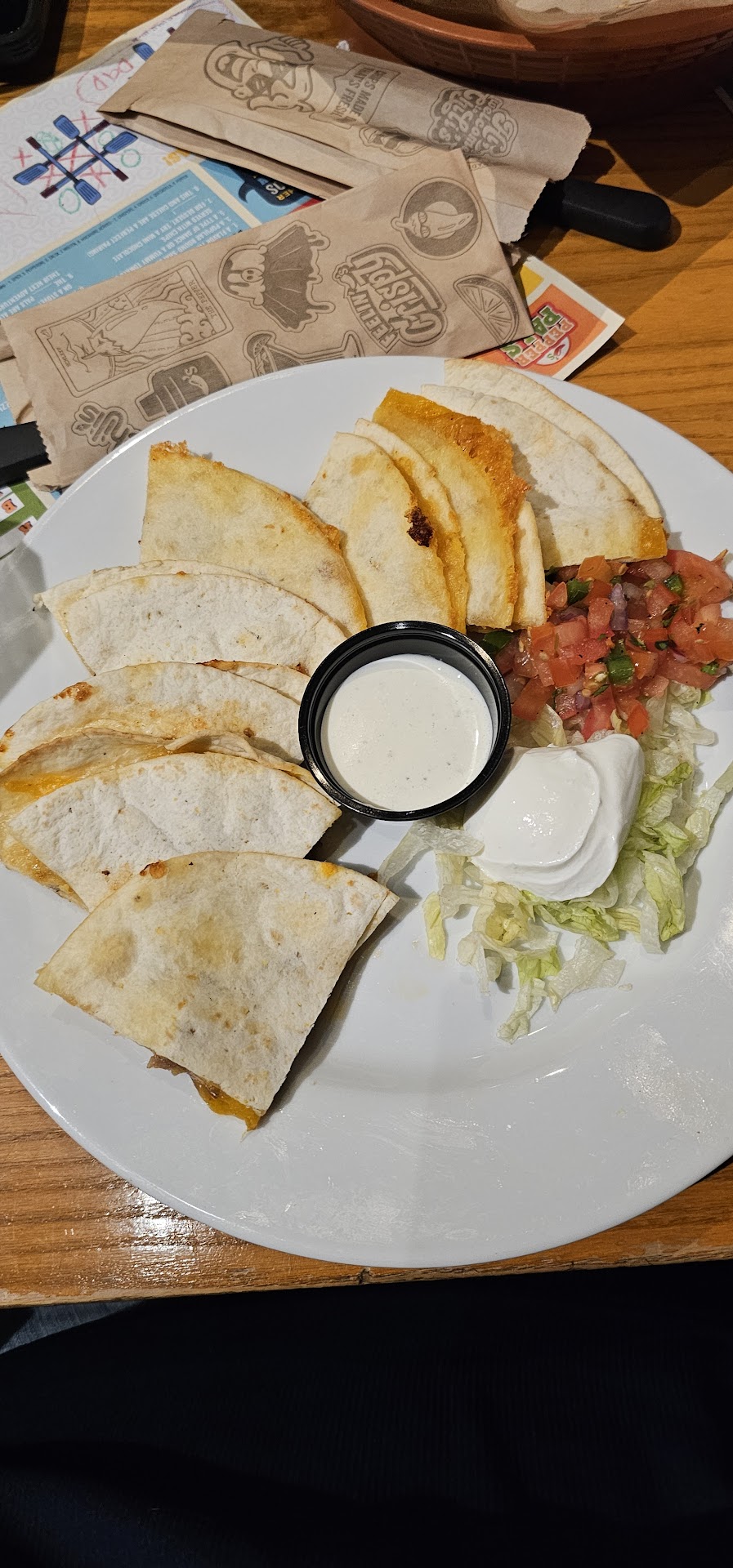 There was some fluid on the floor under the table, now we all have sticky shoes. the server "thought (we) had paid and were chilling" with 3 kids, when in truth we wanted dessert and more drinks. My brisket quesadilla, was supposed to have jalapeno in it. When I looked at it after the first slice, I found quite literally 1/2 of one pickled jalapeno, in one piece of it. It was very little brisket in it at all, and it cost $17. The kids mac and cheese is a step DOWN from Kraft mac and cheese, my kids who love mac and cheese did not eat it. The adult mac and cheese was slightly better, and the fried chicken strips were pretty good. The broccoli as usual was awesome, which is why food rating is three stars. The table next to us got fed up with the server not attending to us and they skipped out on the bill. Yes, it was wrong, but I get it. Another table at a high top was so mad at the waitress, they left her zero tip. When she talked to her manager and told them that she forgot about us, we were supposed to get some form of discount. I guess we did, we got I think $8 off. We were literally sitting for 45 minutes with no contact from the waitress. We watched her running from table to table in different areas. THIS WAS NOT A GOOD FAMILY EXPERIENCE. I included a photo of the $17 brisket quesadilla, before I...