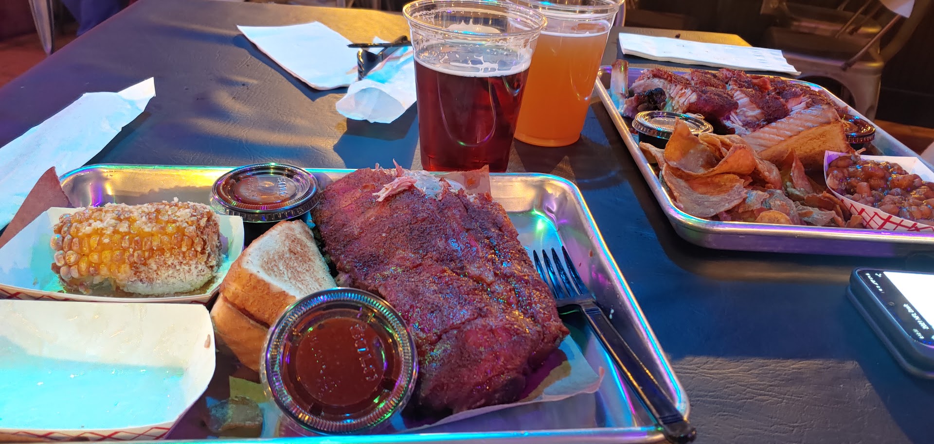 The baked beans had a really good seasoning in them, and the chips are house made! The table caddies had different styles of bbq sauce for different tastes. I thought that was nice!