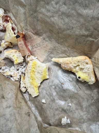 I noticed they were bringing my daughter her sandwich. I headed back to the table and my oldest son and I finally received our sandwiches almost 5 minutes after the first sandwich came. Still no napkins. My daughter had to go up to the counter to find someone to provide napkins and a fork for the potato salad. My sandwich was lukewarm at best. My daughter's sandwich was cool and disgusting. It was a big sloppy mess of sauces that tasted as though they had turned bad. (Southwest chicken) No one at the table could tolerate the taste. We left the entire sandwich. All of the other sandwiches were so-so and none of us finished the dry and mushy excuses for food. The manager checked in with people who had recently arrived but was conspicuously trying to avoid all the tables that had waited for forever to get their food.