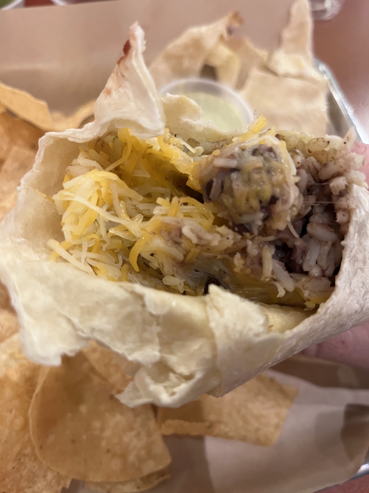 The burrito was black bean, rice and cheese only. You can see that the food temperature wasn’t hot enough to melt the cheese.