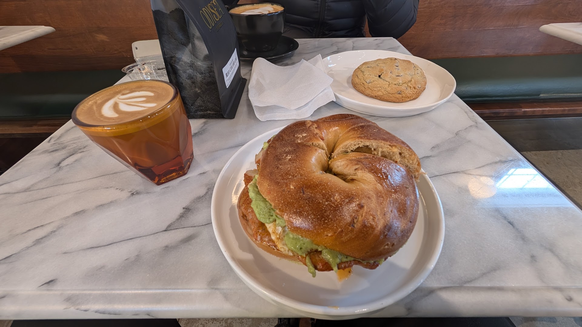 A+++++. I can't decide what is best about Odysea. The fresh baked goods, each one I've tried is amazing and so creative. They have the usual items and then others that blow you away, like the blueberry bread pudding. The bagels are worth the drive there alone, especially the jalapeno bagel. Then when they add egg and cheese, out of this world goodness. The chorizo is spectacular. I'm not even kidding you. It's the best around, easily. Homemade cream cheese? Yep, they sure do and it is spectacular. The salads are creative and fresh out of the garden fresh. Then there's the coffee which is fresh roasted right on site. The beans they roast come fresh from Honduras. When you combine that freshness along with the careful attention to detail from the baristas, who themselves are masters of their craft (more of that later), you get a superb cup of coffee. A cup of excellence, which also happens to be a prestigious rating in the coffee industry, cup of excellence. The folks who make the coffee, each A+ all stars. Try this when you go... Ask them to make their favorite drink for you. You'll get something excellent. I like a cortado. Easy to find when we lived near Seattle, here in New Hampshire? Not so much. Here at Odysea they know exactly what it is and make it exactly right. It's award winning perfect. The pour over smells so good and fresh, then tastes even better. There isn't a better collection of coffee artists in New Hampshire. The baristas here could win awards with the skill and attention to detail. The seating inside is perfect. Tables and chairs if you want that, comfy chairs if you want that. If you like to sit at a counter, they have that too. Good Wi-Fi if you need to catch up on work. They play music, but it's not too loud that you can't talk at the table easily. They also have nice clean bathrooms and even a selection of clothing to buy while you're there. Stop in if you're close. Stop in if you're not close. You won't regret the decision. We'll drive an hour one way to stop in....