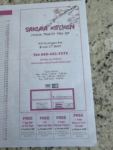 Read moreFirst time here and figured to try it because it’s being talked about on a few pages on social media. Plenty of parking but it’s easy to drive past it even though there’s a sign by the road, the place itself is set off the road and that part of Farmington Avenue is a drag strip. Food - I ordered the sesame chicken lunch special and as one other place that I ordered from, compared to others..you don’t get anything with it other than rice. So other places such as Lotus, China Chef, Sun Fat, Lee Po, etc..you get an egg roll with your lunch…not here. I ordered one anyway and it was delicious. The portion for the lunch was plentiful and the rice was great. The menu showed a red mark meaning spicy, there was zero spice to it. Overall…it wasn’t bad and will go back..but it’s not a place I would say is the best of the best..or even amazing…it’s Chinese food. I’ll continue my search...