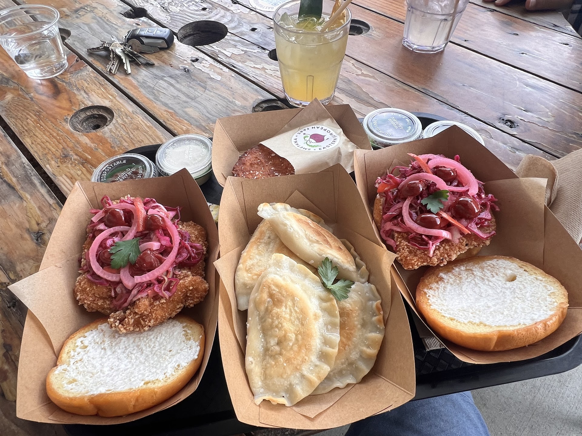 We both got the schnitzel sandwich with the pickled veg and preserved cherries which is always a slam dunk! The kids had the smoked cheddar hash brown and pierogis which have a subtle edge that is crispy combined with the traditional flavors you’d expect from a...