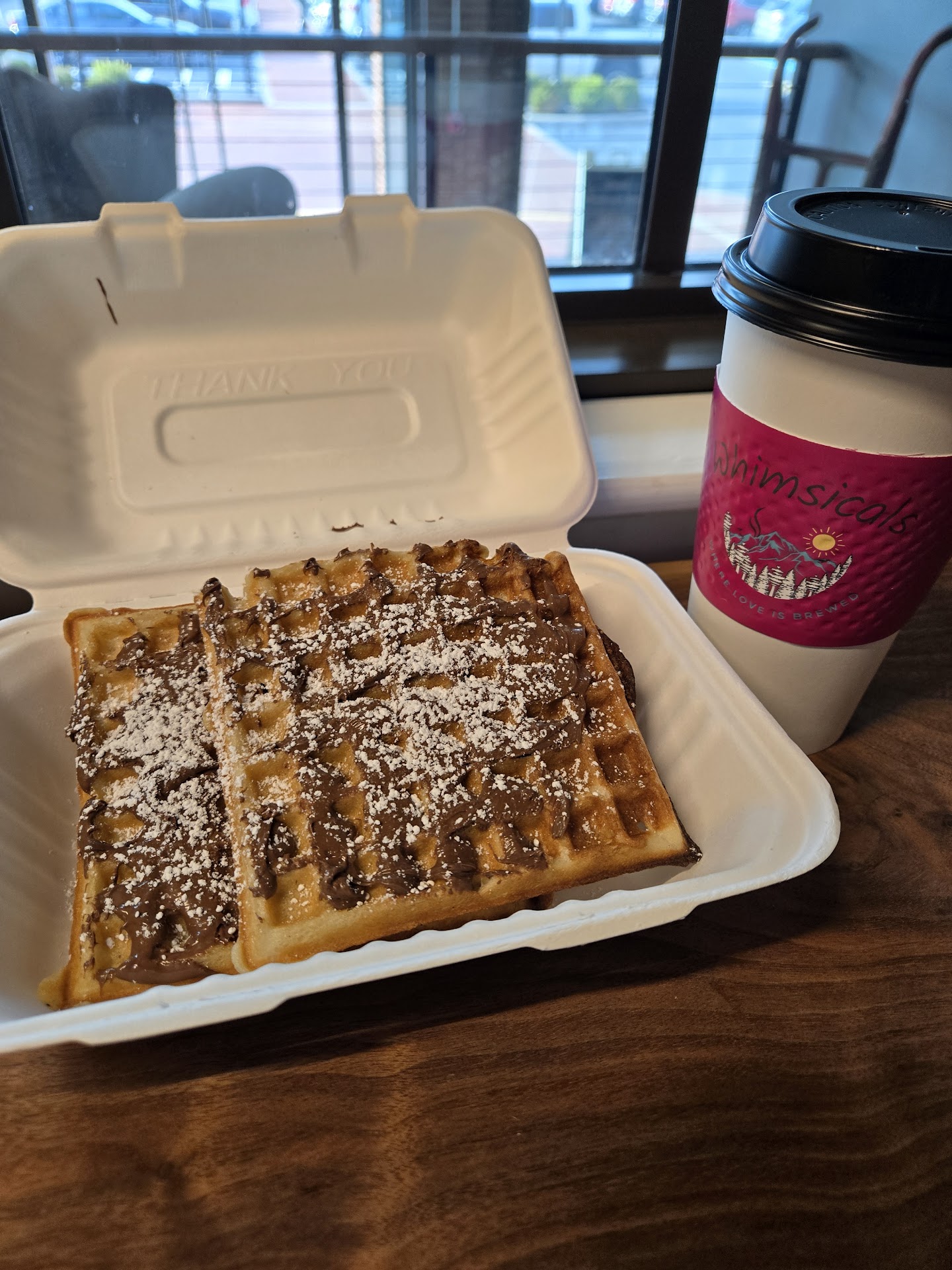 Read moreFound Whimsicals on find me gluten free and decide to stop by for breakfast while traveling to the area. I'm so glad we did. My wife and I both got the mini waffles (always gluten free). I'm celiac so always dread trying to find quick breakfast while traveling. The mini waffles were delicious, and so was the pastry (sour cream muffin with a coffee cake crumble on top). I had the caramel apple cider and wife had the chai latte. Both were delicious. The building was also very nice and clean with a...
