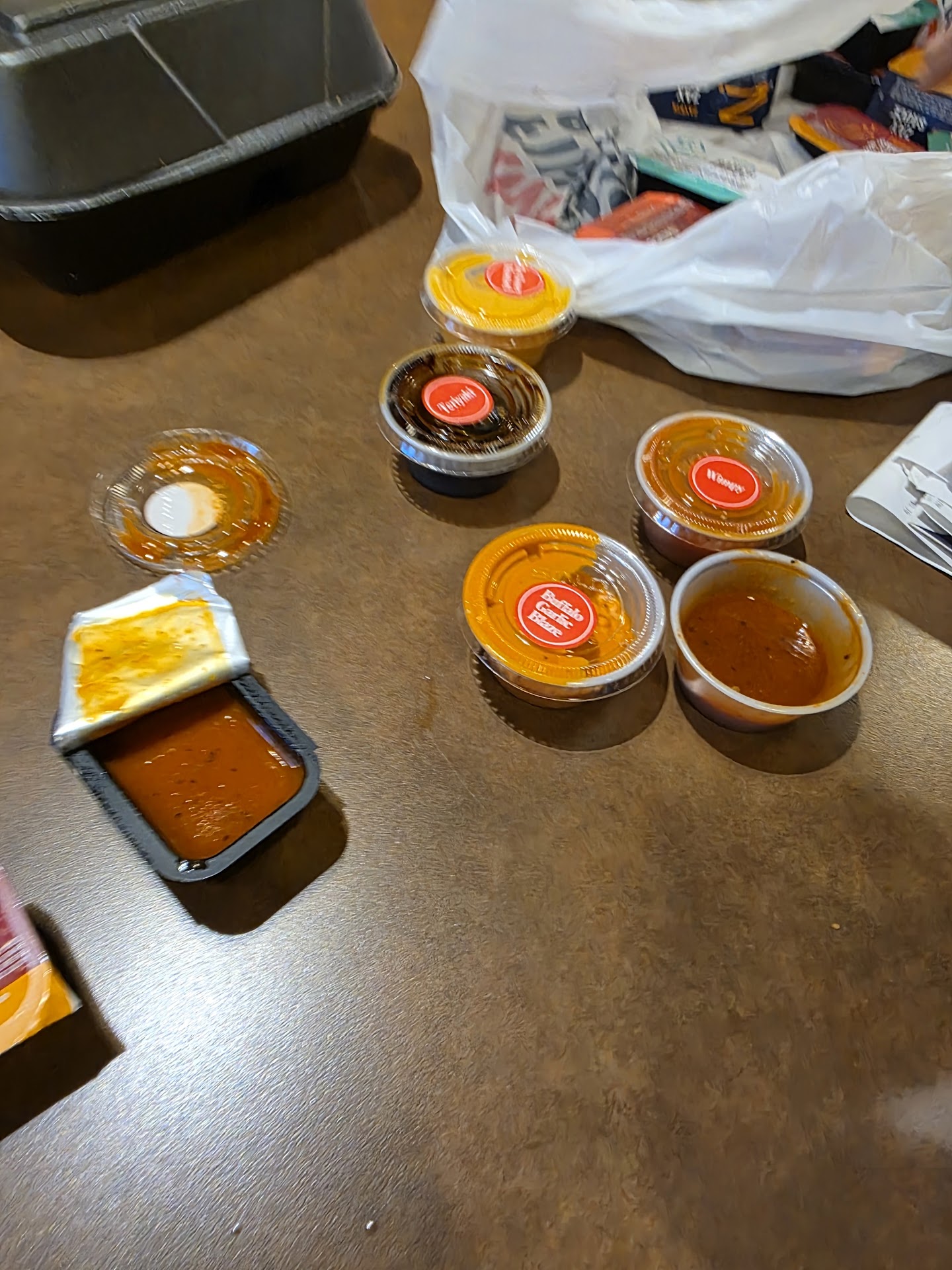 After several minutes, just under 10-minutes, I picked up my order from the counter. Upon sitting down, I found that the wings were mostly dry, i.e., sauce had been applied to only 34 wings but not over the entire wing and the other wings had no sauce applied to them at all. Of course, I requested additional sauce but the fact that I had to be the one to apply the initial sauce my own wings was the primary reason for the rating.
