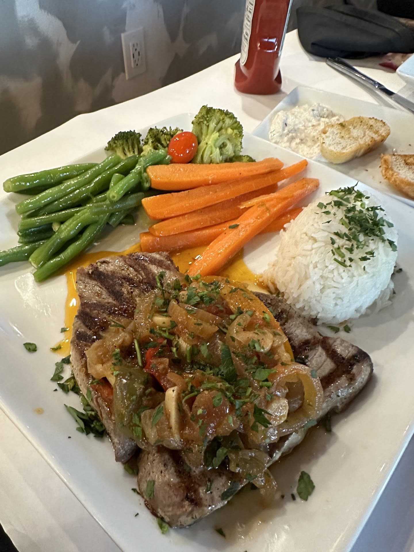 I ordered the grilled tuna steak, and it was absolutely delicious. The fish was perfectly cooked, tender and flavorful, served with a selection of fresh vegetables (Kumida sta sabi!)