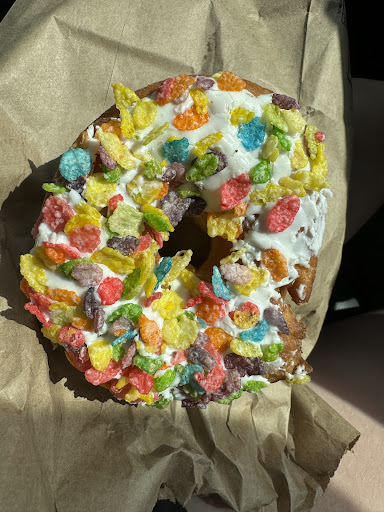 Really creative donuts and coffees (even blended coffees, coffees with ice cream, etc). Donuts tasted good and were a hit! 3 donuts for $5 was also nice. Prices get so high but this is an affordable treat! Doors were hard for me to open: a bit heavy. They do not have stairs though and they do have bathrooms! Free parking lot too.