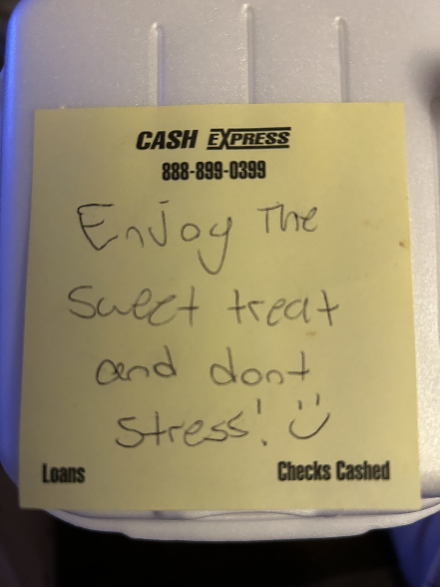 Hey yall!!! Today 1/31/25 I placed a to-go order they were short staffed because they had people call in which is normal but both the owner and his wife were there making it happen anyway! But the two young ladies that did show were trying there absolute hardest which was amazing to see they all stepped up! But the young lady that took care of me went above and beyond even under pressure to take care of me and I didn’t even get her name 😞 I told her I was treating myself cause it’s just been a rough day so I needed chocolate and ice cream trying to make light of my rough day we giggled and I left with my food. But when I got home i realized she went above and beyond just for me and left me a note on my dessert to make me feel better when all of them were struggling just to make it through their shift idk who she is but yall have a great staff and good food thank you for making my belly and...