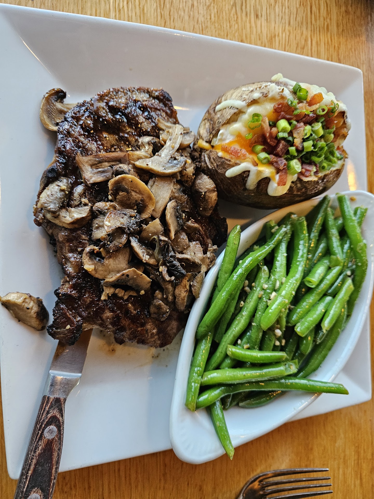 I went with the 14oz Ribeye, loaded backed potato and green beans. With the exception to salting the green beans to taste, the entire meal was very good and full of flavor. While dining I was happy to see new customers where not set immediately adjacent to a seated table, but staggered to minimize noise and promote privacy, again another trademark of good customer service. Although I didn’t need anything during my meal, my server kept an eye on me while attending her other customers, picking up on my satisfaction without having to stop and ask every time she passed.