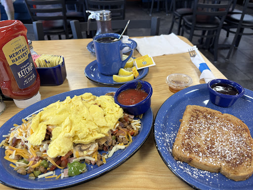 On this day, I had a work training nearby and had skipped breakfast. After considering a few places, I am grateful that I decided on Blue Coast Café. I arrived around noon to a decently filled restaurant. The entrance puts you face to face with a host behind the counter. The space was efficiently sized and not bursting with ambiance but I found the simplicity pleasing, reminiscent of a classic straightforward diner. There are framed pictures and fixtures alongside both the bright red and pale blue walls providing guests with a sense of the countryside. Most of the seating is tables with booths along the wall. The host invited me to sit wherever so I sat almost exactly in the middle of the restaurant since about every other table was emplty. My server’s name was Heather, 1 of 2 waitresses at the time. She gave me a tall 5-page menu that left me very impressed. Not only are there plenty of food options (breakfast choices, lunch options and everything in between) but the physical menu itself was well designed: large pages, balanced wording, simple colors and very easy to navigate. Mostly everything on the menu seemed good (perhaps because I was hungry) but I ordered a hot tea and Smoked Sausage Skillet and swapped the B&G/Toast/pancake for french toast. There was only tea choice (Lipton, Black) that came out almost immediately. After returning from washing my hands (wishing I would’ve brought a book), I listened to the rustle of the restaurant and chatter of the patrons as I drank the tea waited for the meal. Coworkers, families and older married couples convened. It was comforting. The food arrived within 15mins of ordering. The skillet looked mildly appealing: scrambled eggs on top, the cheese was next, all on a bed of crumbled sausage and veggies. Though the cheese wasn’t 100% melted, the plate completely filled with food. I couldn’t resist! I added salt & pepper and began mashing the ingredients together. It was a delightful assortment of flavors and consistencies. The French toast wasn’t mind blowing but definitely better than average. Heather made sure the syrup was hot and condiments (salsa & ketchup) were brought. 10/10 meal, hunger satisfied!