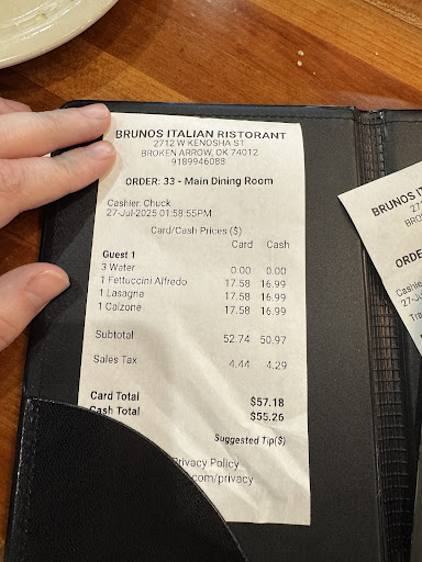 Read moreWe just went here for our 3rd anniversary, it only opened a few weeks ago. We had this fantastic waiter, Chuck, who have us a quick history of the owners, they previously owned Gino's in Muskogee for 19 years and they have a Sicilian/Albanian background. The waiter himself has travelled through a lot of countries and has a ton a great stories and advice about travelling as well as his extensive time working for the owners. We asked what he recommended and he said the chicken piccata, so that's what I ordered. I'm half Italian, half Spanish, so I'm picky when it comes to Italian food, and let me tell you, this place hit the nail on the head. The chicken was beyond delicious and juicy and the sauce on the noodles was incredible. My wife had the shrimp appetizer with linguini noodles because she was craving a shrimp scampi, which they didn't have, but this came so very close. Needless to say, we used the fancy twisted butter bread they gave us to sop up the plate until there was nothing left but a clean plate. The prices average about $16-$17, but the serving size is well worth it!! We are now making this our go to Italian restaurant in broken arrow / Tulsa area. And plan to spend every anniversary going forward at this location. Thank you Chuck and Bruno's for making our special day that much...
