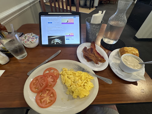 As expected, the tomatoes were rather green, and the gravy had no taste. The biscuit itself is homemade, flaky and fluffy with a really good taste to it. Sadly, all that work is done in by the ultra bland gravy. It required a lot of pepper and salt, and even some of the pieces of bacon to try to give it any type of taste other than just nothing. Iām still on the hunt for a good every day breakfast place.