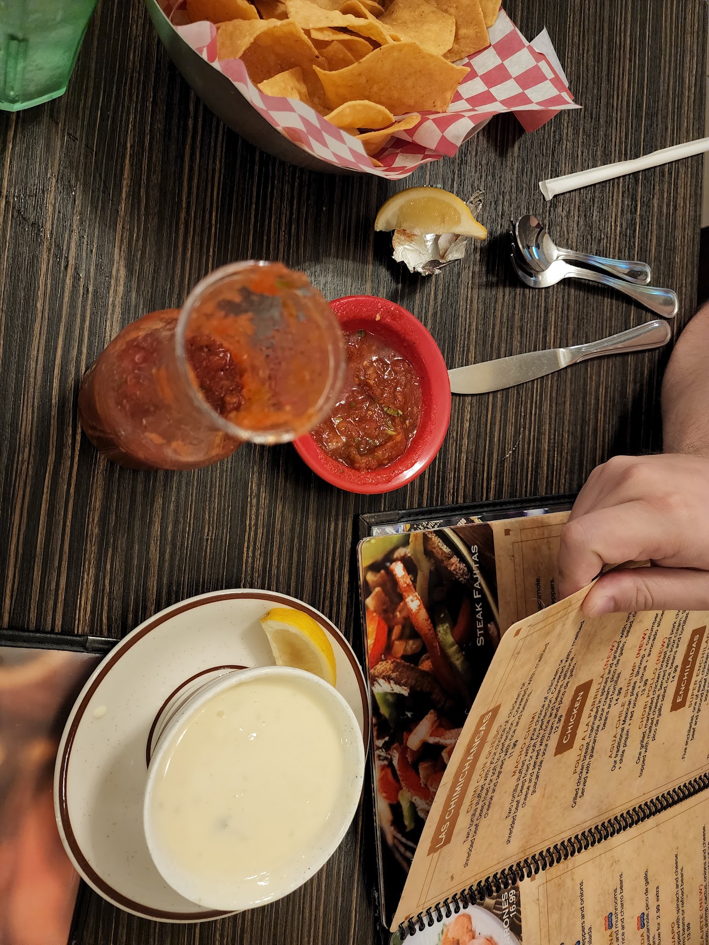 We arrived just after one, so we missed whatever lunch rush there might have been. We were seated promptly and got our drink order in when the guy brought the chips and salsa. Honestly, for me the salsa was the high point of the meal.