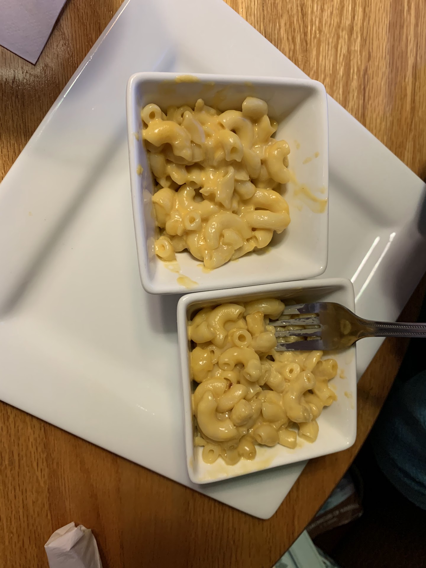 We ordered two kids Mac n cheeses with Mac n cheese as the side on one and fruit for the other. The portion was decently sized for a kids meal. The Mac n cheese lacked flavor though, even with adding salt and pepper it was subpar. The fruit salad was the equivalent of canned fruit cocktail.