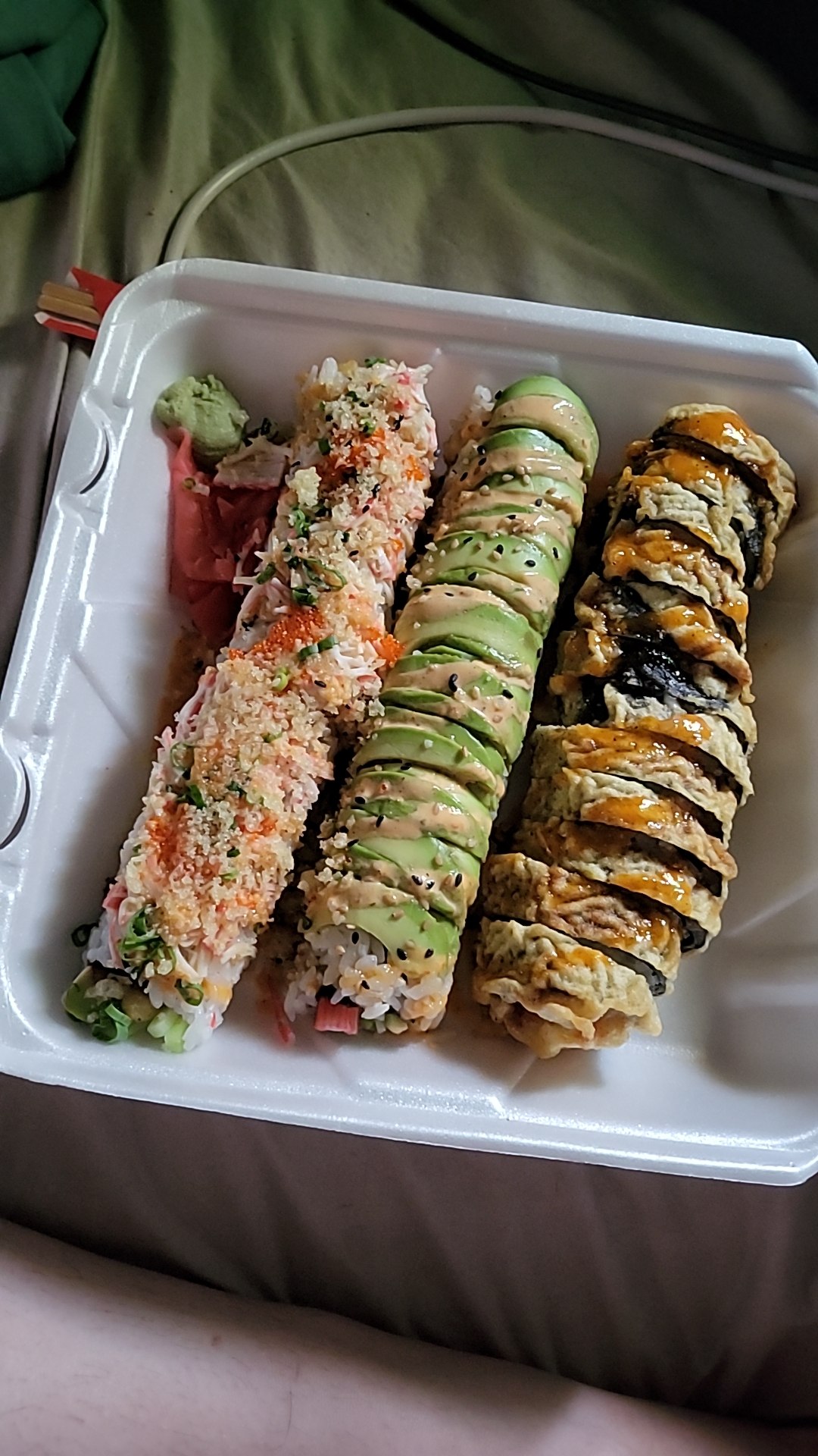 Photos attached are unfortunately from a pick-up order and not on their fun plates with stellar presentation, but tasted insanely good regardless. Left to Right: Pimp Daddy roll, Caterpillar roll, and...