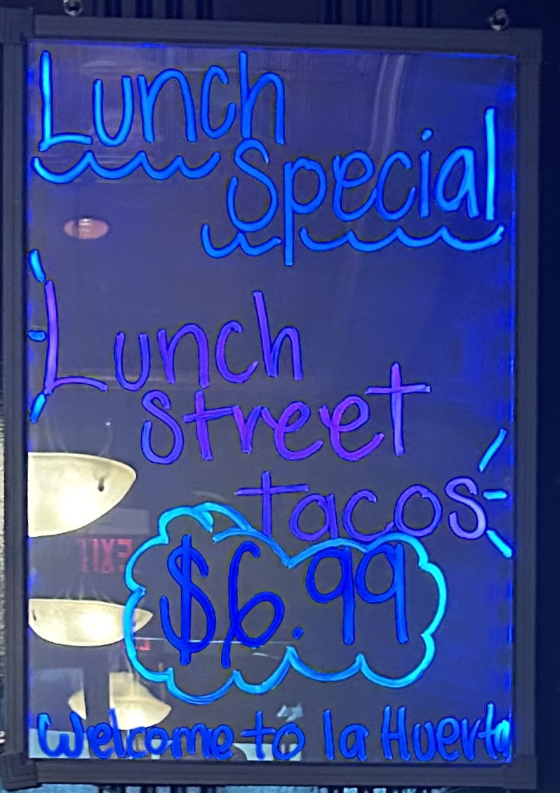 Read moreWent to La Huerta Grill for the first time tonight for dinner in response to heavy advertising for “Taco Tuesday” with low priced Margaritas and street tacos. We were seated soon after entering lobby and seated in the bar. We chose a pub table because the booth we were given had a rocking table. It was corrected quickly but we liked the pub table since we were established. Rigo and Ramon both took care of us through dinner. I have a severe allergic reaction to Cilantro; and in many restaurants were it is usually in lots of food items and limits my choices, Rigo and Ramon made sure my order did not have any. They brought me queso while my wife had their salsa that she said was very good. They even had fresh guacamole made for me without Cilantro and it was some of the best I’ve had! We really liked the food. My Camarones a la Diabla, with 3 tortillas, was very spicy as expected, and my ala carte al Pastor street taco was excellent. Service was very good [the right hand did know what the left hand was doing] and other staff was attentive too. The young girl at the counter at the entrance made fresh tortillas, cleaned used menus and seated new arrivals too—impressive attention to details all around. Mauricio Sanchez, singing at the fireplace, started right after 6 PM and had a nice voice and was pleasant to hear while there. We...