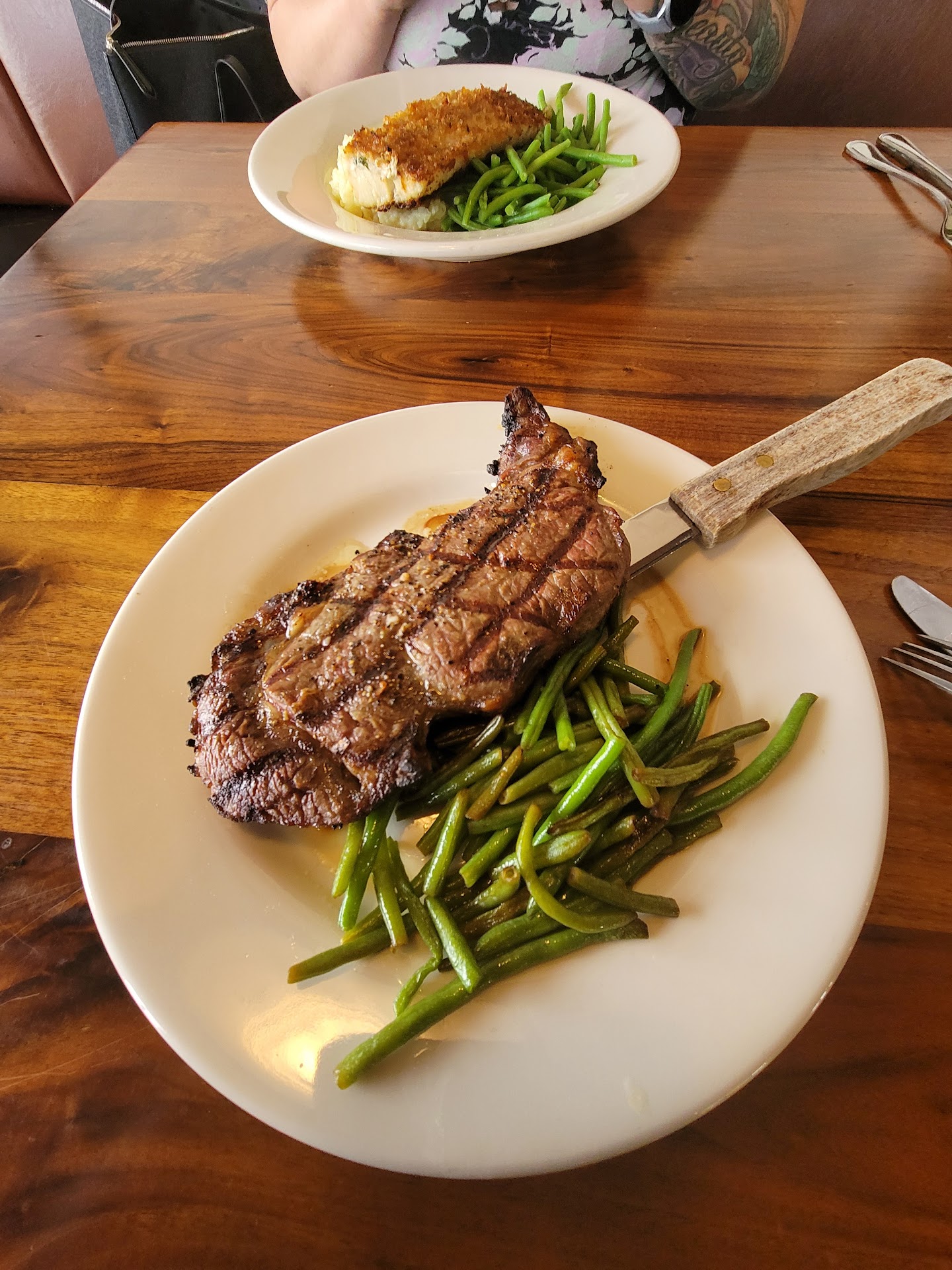 We felt the main entrées took a bit come out, especially since it didn't appear to be too busy, but not long enough to Starr questioning if there was a problem. Literally a few minutes later after commenting to one and another our food arrived. Our plates were visually pleasing to the eyes, but a few things feel short. My steak was ordered medium rare but more on the medium side. If had much more done I would've requested then to cook another. The flavor was good but the steak wasn't as tender as I was hoping for. The green beans were good.