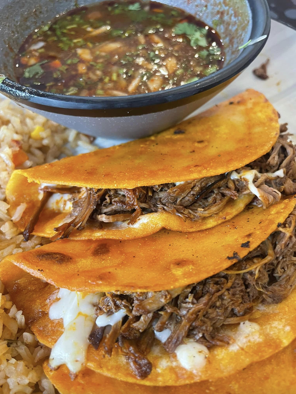Part 2] I couldnât wait longer so I went back today to try something else. đ€ I sat down, got my chips and salsa and the menu. I knew what I wanted and asked an employee about the Birria and he suggested it so I ordered it. While I waited, I munched on the yummy chips and salsa. The salsa was so good, not hot but solid flavor. The Birria didnât take long to arrive and boy. I was mesmerized. The consomĂ© looked perfect. There was so much food that I immediately knew I wasnât gonna finish it all - BUT I DID. The tacos at least. The rice 10/10 THATS HOW ALL RICE AT MEXICAN RESTAURANTS SHOULD TASTE. It was soft and had corn, green beans and maybe peas I canât remember but come on, perfect. The beans were yumm, you know just beans and waaaay better than other places. NOW TO THE BIRRIA: they are pretty good sized tacos, super cheesy that Iâd take a bite and the cheese would just keep going! The meat on point of course, but when I dipped it in the consomĂ© my mouth decided to have a party and all the flavors were just SO YUMM. Thatâs a perfect birria taco. I literally kept dipping my chips in the consomĂ© because I just wanted to keep eating it but ran out of the tacos! Ok thatâs all. 10/10 customer service. 10/10 food.
